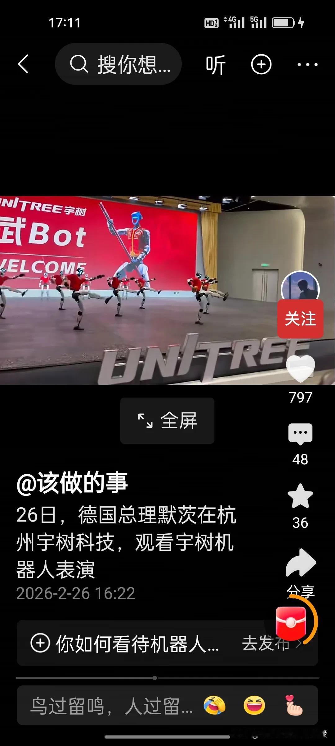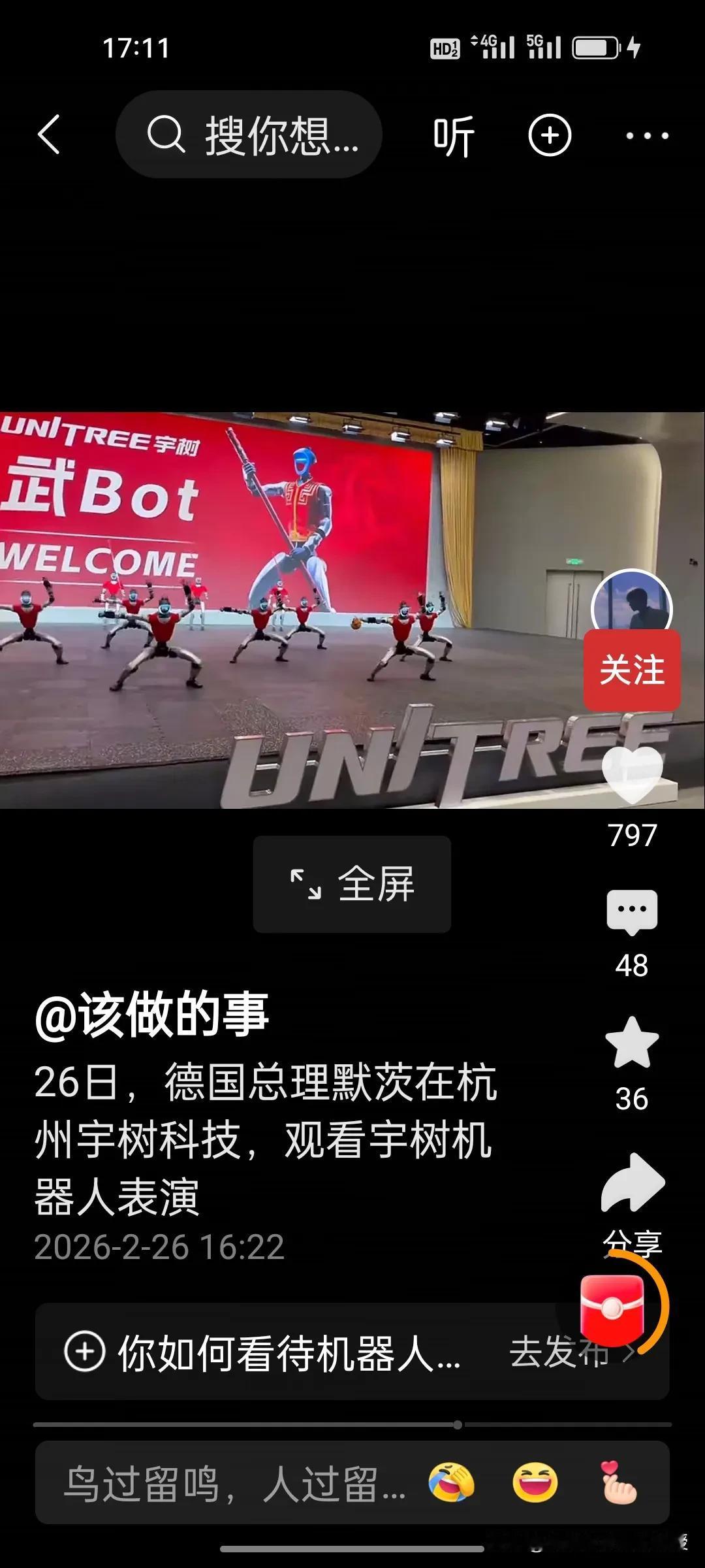 默茨现场看呆了!中国机器人打拳、耍棍,比春晚还炸! 德国总理默茨今天下午坐着红旗车现身杭州宇树科技,王兴兴亲自迎接。现场,默茨和30位德国访华企业家们一起看武Bot:机器人耍长棍、打拳击,动作丝滑流畅到让人连连称赞。 默茨看得津津有味,全程紧盯舞台,还忍不住点头笑。这台武Bot刚上过春晚,现在直接把工业级表演搬到外宾眼前,默茨心里肯定是佩服至极啊! 从人形机器人到四足机器狗,近期,宇树科技不断发新品,宇树把“中国智造”已经迈向新高度。不排除此次德国企业会有跟宇树科技合作的可能性。 当默茨还在回味机器人灵活自如的出拳时,我们已经在思考:下一个让老外震撼的中国科技会是什么?