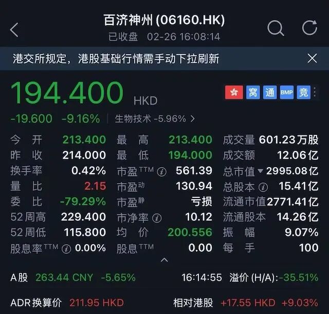 伴随着股价大跌,百济神州2月26日在港股市场的市值跌破3000亿港元,最后报2995亿港元。
