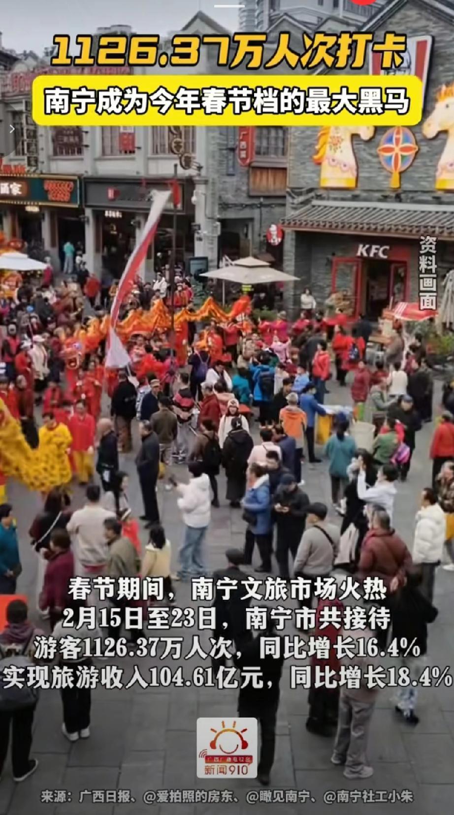 2026年马年春节档南宁文旅迎来爆发式增长,暖冬花开的气候成为避寒过年优选,青秀山12万株郁金香花海、新春灯会吸引135万人次打卡,游客量居广西景区首位 ,央视2026春节戏曲晚会首次实景落地南宁民歌湖,全网话题阅读量超5.1亿,直接拉动文旅消费 邕州古城(三街两巷、中山路等)9天接待203万人次,营业额破2416万元,民俗演艺、AR互动等让老街区成全时段消费场景2026年2月15日-23日春节假期,南宁共接待游客1126.37万人次,同比增长16.4%;实现旅游收入104.61亿元,同比增长18.4%,两项数据均创历史同期最高纪录 。一举成为成为春节档文旅黑马。(来源于@广西台新闻910)