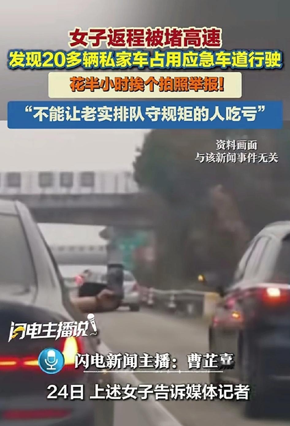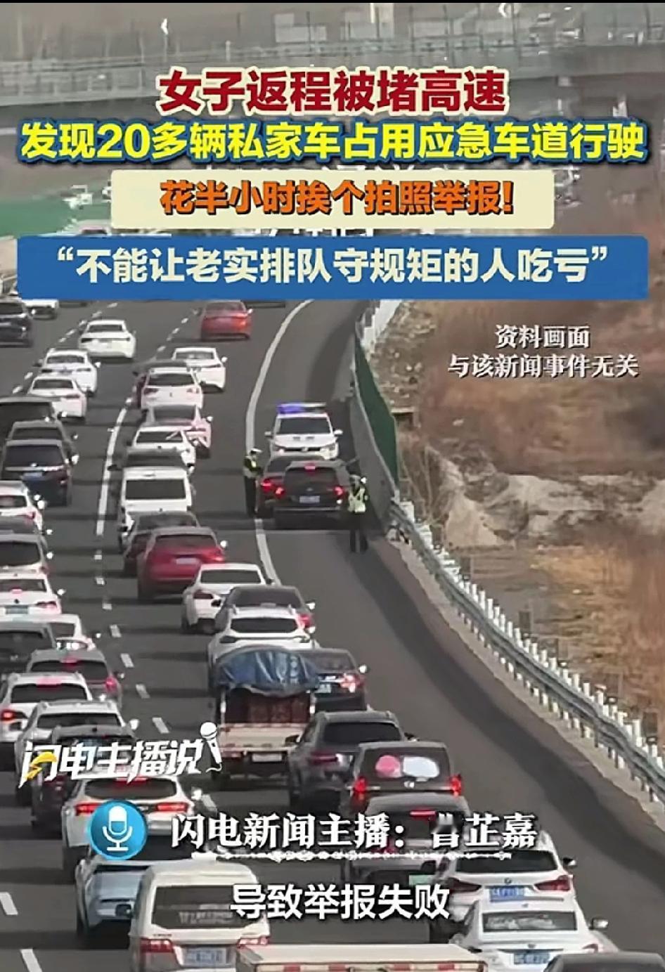 湖北,一女子返程遇高速堵车6公里,看见大批车辆闯入应急车道,她坐在副驾越看越火大,直接拿起手机拍下20多辆车上网举报,有人点赞有人热议,全网吵翻了天! 2026年2月23日,春节返程最高峰。 一名女子和家人从广西出发,返回湖北武汉,车行至湖南境内高速路段时,彻底被卡住。 前后一眼望不到头,密密麻麻全是车,刹车灯连成一片红色长河。导航显示,拥堵长度接近6公里,车流半天挪不动一米。 车里空气沉闷,大家都憋着一股躁气。 正常车道里,所有人都在耐心排队,没有人加塞,没有人乱挤,都在守着规则,一点点往前走。 可就在旁边,应急车道上,离谱的一幕不断上演—— 一辆、两辆、五辆、十辆…… 越来越多的私家车,像是看不见禁令标志,纷纷方向盘一打,直接压着实线冲进应急车道,油门一踩,嗖嗖往前窜,把老老实实排队的车辆远远甩在身后。 有人带头,就有人跟风。 原本清净的生命通道,眨眼间变成了“专用快车道”。 他们一路畅通,留下规规矩矩排队的车主,在原地望车兴叹,心里又憋屈又愤怒。 女子坐在副驾,把这一切看得一清二楚。 她越看心越凉,越看越生气: 大家都在堵,大家都着急回家,凭什么老实人就要白白吃亏? 应急车道是救命的通道,是给救护车、消防车、抢险车留的生命路, 不是给这些人当捷径的! 如果前方发生事故,救护车被堵在应急车道外,那耽误的,就是一条甚至好几条人命! 她越想越坐不住,当即拿出手机, 打开湖南高速交警“随手拍”举报平台。 她没有大喊大叫,没有情绪失控,而是沉下心,认真、严谨、逐辆车取证。 前方应急车道一开过去一辆,她就立刻调整角度, 对准车牌、车身、实线、应急车道标识,清晰拍下完整画面。 一辆、两辆、三辆…… 手指不停滑动、点击、保存、上传, 整整半小时,她保持同一个姿势,眼睛紧盯窗外, 不放过任何一辆占用应急车道的车。 有些车主发现被拍,还刻意躲闪、加速、 但她依旧冷静、坚持,稳稳把证据固定下来。 最终,她一口气上传举报20多辆违法占用应急车道的车辆。 面对别人的不解,她只坚定地说: “我不是多管闲事,我是不想让守规矩的人寒心。应急车道不能被糟蹋,老实人更不能被欺负。” 举报之后,系统很快反馈: 有3辆车,因为拍摄角度、清晰度不够、特征不明确,不符合证据要求,举报未成功; 其余全部举报信息,均已受理,交管部门正在逐一核查、依法处理。 有律师朋友说: 非紧急情况占用高速应急车道,一律记6分,罚款200元。 情节严重、不听劝阻的,还可从重处罚,甚至拘留。 湖南高速交警也正式回应: 已收到全部举报材料,严格依法处理,同时呼吁所有驾驶员: 应急车道是生命通道,任何时候都不能占用,文明出行,从每个人做起。 事情曝光后评论区吵翻了: 有网友说:干得漂亮!生命通道绝不能被践踏,支持每一个守护规则的人,拍照时一定注意安全! 也有网友说:“虽然有点缺德,但必须给你点个赞!高速堵车,应急车道就是生命通道,如果前面发生交通事故,应急车道又堵了,救护车如何通过抢救?” 还有网友说:“我就是其中一辆车:女子,我谢谢你啊!” 有人理解,有人不理解,有人点赞,有人心疼被扣分罚款。 但所有人都不得不承认一个事实: 应急车道,是救命道,不是快车道。 你多抢那几百米,可能就堵死一条生路; 大家都守规矩,才能让真正需要的人,能及时通行。 这个事情你怎看呢?你会举报吗? 春节返程高速堵车占用应急车道 硬核举报文明驾驶 我是晴风语说事,人情冷暖记录者,持续记录人间的善意与无奈,欢迎大家的关注,谢谢支持!