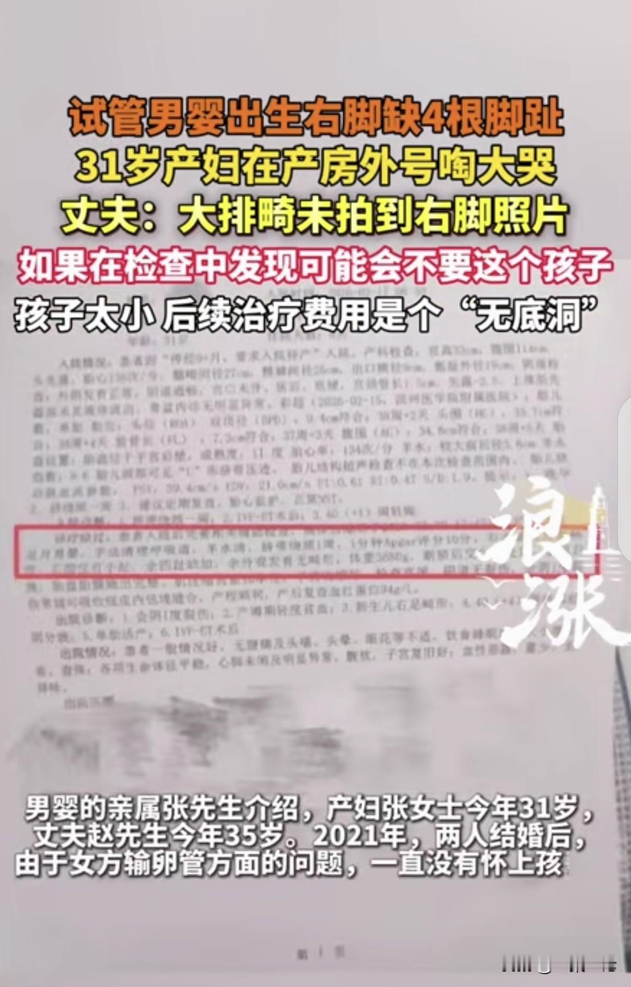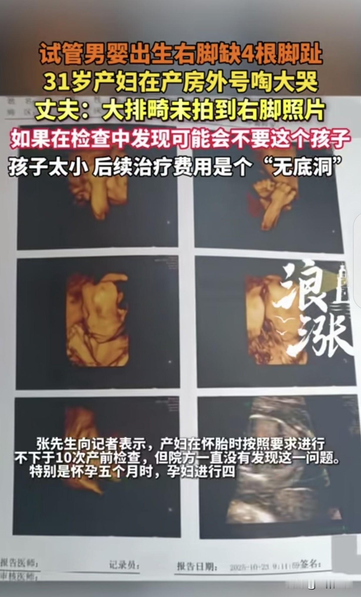 “崩溃了!”一31岁女子输卵管有问题,无法自然受孕,她和35岁丈夫去做了试管,成功怀孕后,女子做了10次产检,怀孕5个月时,又做了四维大排畸检查,胎儿一切正常,可她大年初四生下孩子,竟然发现他右脚缺4根脚趾,女子崩溃大哭。丈夫怒了:如果检查时发现,我们不会要这个孩子,后续治疗费是无底洞。 31岁的张女士和35岁的赵先生结婚4年了,一直没要上孩子。 问题出在张女士身上,她输卵管有问题,自然受孕特别难。两口子跑了好几家医院,看了不少专家,最后决定做试管婴儿。 试管的路走得不容易,张女士打了好多针,吃了不少苦,好在功夫不负有心人,终于成功怀上了。 全家人都乐坏了,尤其是张女士,每天小心翼翼地护着肚子,就盼着孩子能平平安安出生。 按照医生的要求,张女士整个孕期做了不下10次产检。 每次产检,她和赵先生都提心吊胆的,生怕听到什么不好的消息。 好在每次检查结果都显示胎儿正常,两口子这才慢慢放下心来。 怀孕5个月的时候,张女士做了四维大排畸检查。 这可是孕期最重要的一次检查,能看出胎儿有没有大的畸形。 检查那天,赵先生特意请了假陪着妻子一起去。 两人在B超室外等了半个多小时,终于拿到了检查报告。医生告诉他们,胎儿一切正常,发育得很好。 两口子听了,心里那块大石头总算落了地。 转眼间,就到了2026年大年初四。 这天,张女士在医院顺利生下了一个男婴。赵先生在产房外等着,心里别提多高兴了。 可当护士抱着孩子出来,告诉他孩子右脚缺了4根脚趾时,赵先生一下子懵了。 “怎么会这样?产检的时候不是都说正常吗?”赵先生不敢相信自己的耳朵。 他赶紧冲进产房,看到妻子正抱着孩子嚎啕大哭。张女士哭得撕心裂肺,她怎么也想不明白,自己做了那么多产检,怎么就没发现孩子有问题呢? 赵先生看着妻子和孩子,心里又疼又气。他一边安抚妻子,一边想着接下来的日子该怎么过。 孩子出生就有缺陷,后续的治疗费肯定是个无底洞。 如果产检的时候能发现这个问题,他们夫妻可能会考虑不要这个孩子。不是他们狠心,是他们真的没能力承担这么大的压力。 如今,张女士和赵先生正为孩子的治疗问题发愁。 他们不知道医院该不该为这件事负责?也不知道未来的路该怎么走。 他们只希望,孩子能健健康康地长大,哪怕付出再多的努力和代价,他们也愿意。 只是,每当想起产检时的“一切正常”,两口子心里就五味杂陈,不知道该怪谁才好。 有人说,顺其自然吧,做过四维的都知道,医院有告知书,提前已经告知了。手指脚趾看不太清楚,同意就做,不同意就放弃做。 手指脚趾本不在排畸范围,这些不影响孩子生存,试管得来的娃还不珍惜? 还有人说,我记得特别清楚当时做四维的时候医生也是说手脚不包的!我家娃生出来脚趾头有个并趾,婆婆跟疯了一样在医院要找医生,我记得我妈说了一句话,如果当时查出来,会因为这点小问题不要宝宝吗?幸运的是孩子很健康,小并趾也不影响他走路、运动,现在已经是个五年级的大孩子了! 张女士和赵先生的遭遇,确实让人同情。他们历经艰辛做试管婴儿,整个孕期又小心翼翼做了多次产检,结果孩子出生仍有缺陷,这换做谁也难以接受。 不过,四维大排畸检查虽能发现不少胎儿畸形,但受超声物理特性限制,像手指脚趾这类微小畸形,确实存在漏诊可能。 医院在检查前一般会告知相关风险,让孕妇和家属知情选择,这其实也是一种负责任的做法。 对于赵先生夫妇而言,现在最重要的是照顾好孩子,积极寻求治疗。 虽然治疗费可能是个负担,但孩子的健康才是第一位的。而且,手指脚趾的缺陷,并不影响孩子的生存和基本生活能力,未来通过手术等方式,也有很大改善空间。 同时,这一事件也给其他准父母提了个醒,产检虽重要,但并非万能。 在做好产检的同时,也要做好心理准备,接受孩子可能存在的不完美。 毕竟,每个孩子都是上天赐予的礼物,无论他是否完美,都值得我们用心去爱和呵护。 《民法典》第1218条规定,患者在诊疗活动中受到损害,医疗机构或者其医务人员有过错的,由医疗机构承担赔偿责任。 在此案例中,如果医院在四维大排畸检查中,未尽到与当时医疗水平相应的诊疗义务,如未按照规范操作或未充分告知检查局限等,导致胎儿畸形漏诊,且该漏诊与孩子出生后的损害后果存在因果关系,那么医院可能需承担相应赔偿责任。但若医院已尽到合理诊疗和告知义务,则可能无需担责。 对于这件事,你怎么看? 欢迎关注@一案一论