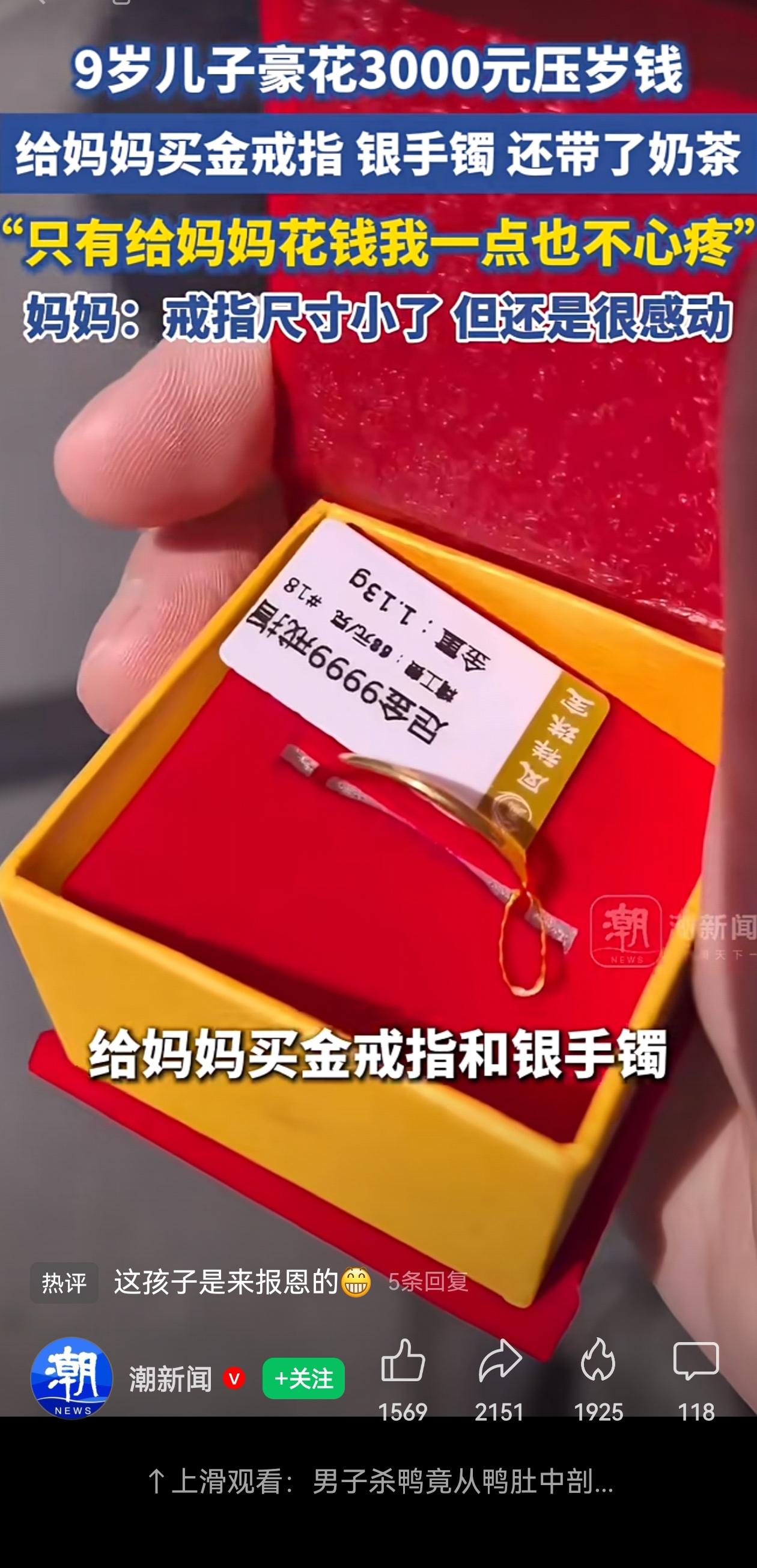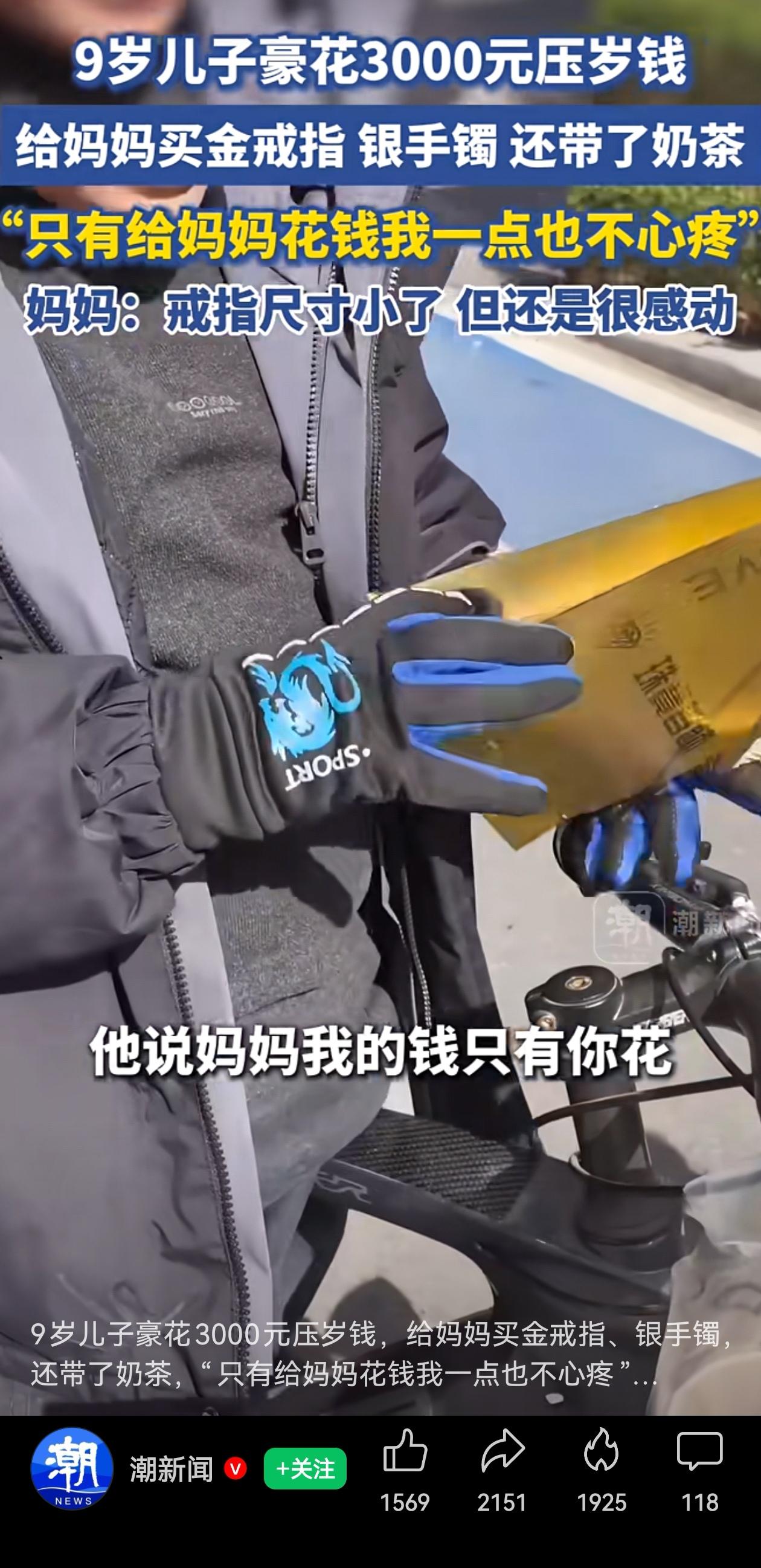 浙江桐乡这个9岁的小男孩,真的是来报恩的吧? 一个9岁的小不点,自己偷偷骑车出门,揣着自己刚刚得到的的压岁钱,整整3000块!给妈妈买新年礼物——首饰,不仅有银的,还有金的! 小男孩给妈妈精心挑了一个足金戒指,一个银手镯,还外加杯奶茶! 这哪是一个9岁小孩子呀?分明是来报恩的小天使嘛! 最暖心的是男孩说的那句话:“只有给妈妈花钱,我一点也不心疼。”这位妈妈应该是全世界最幸福的妈妈了吧?儿子有钱舍不得给自己花,结果给妈妈花起钱来,3000块压岁钱掏得干干脆脆! 虽然戒指买小了,但那又怎样?就像网友说的“尺寸小了,爱刚刚好”。这不就是孩子眼里最纯粹的爱吗?他不知道尺寸对不对,但是知道妈妈喜欢黄金,而且自己舍不得买,他就给妈妈买。 而且妈妈说这不是第一次了,去年就买过,今年继续兑现承诺。这种每年都被儿子狠狠爱着的感觉,你说她幸不幸福?太幸福了! 今年是第二年兑现“每年给妈妈买一件”的承诺。去年就给妈妈买过金首饰,一个9岁的孩子,把对妈妈的承诺记了一年又一年,今年果然又给妈妈买了! 说实话,小孩子知道承诺的事情要完成的不多吧?今天说的话明天就忘了太正常了。可他把这句话记在心里整整一年,得了压岁钱,攒着,悄摸着就等着给妈妈惊喜呢! 这位妈妈太幸福啦!想想看,每年都能收到儿子用心挑的礼物,这种被惦记、被放在心尖上的感觉,是不是比什么真金白银都珍贵呢? 信息来源:潮新闻