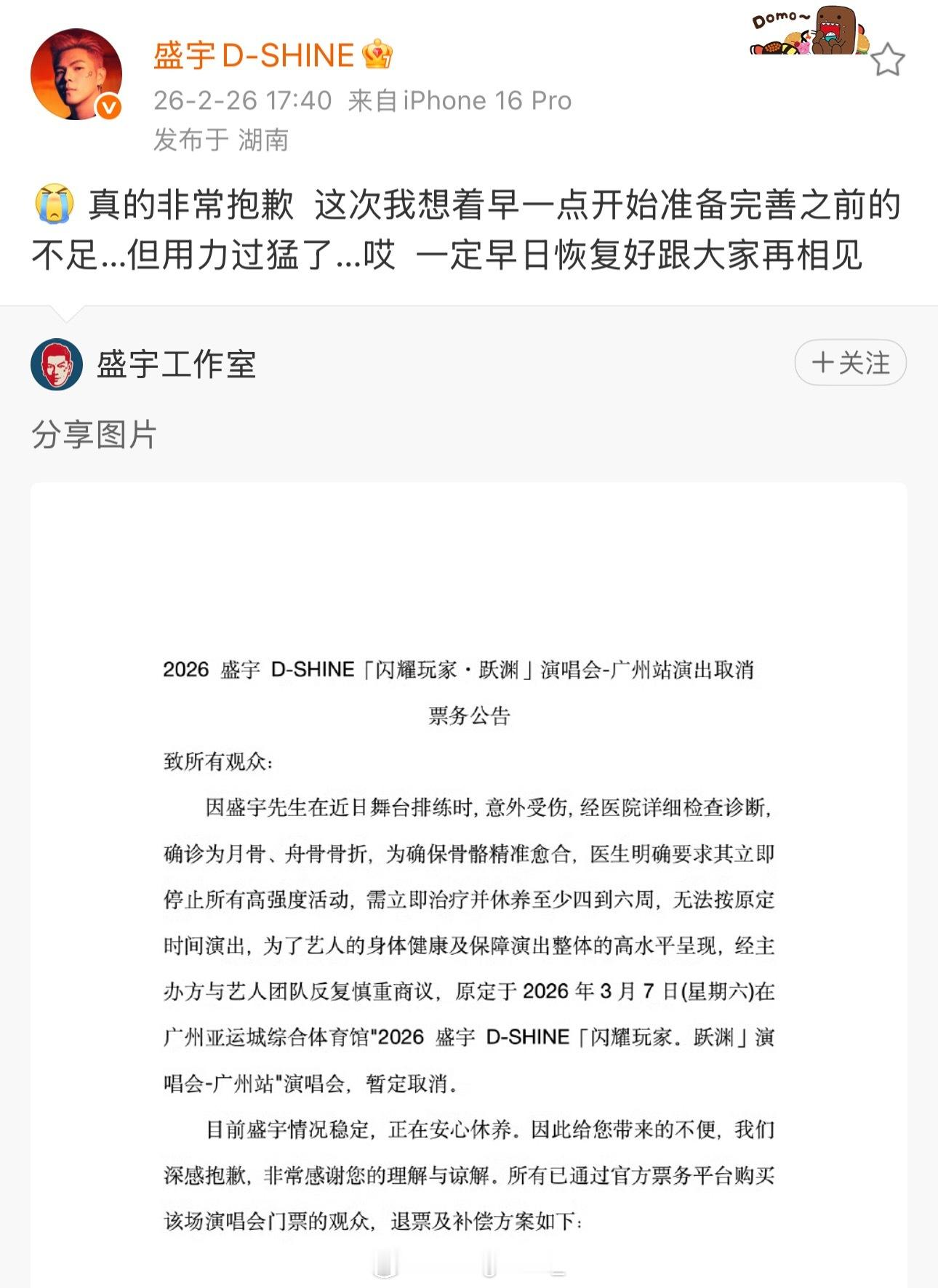 盛宇演唱会官宣取消!盛宇因为排练时意外受伤骨折,需要休养4-6周,盛宇表示自己会早日恢复好再跟大家见面!