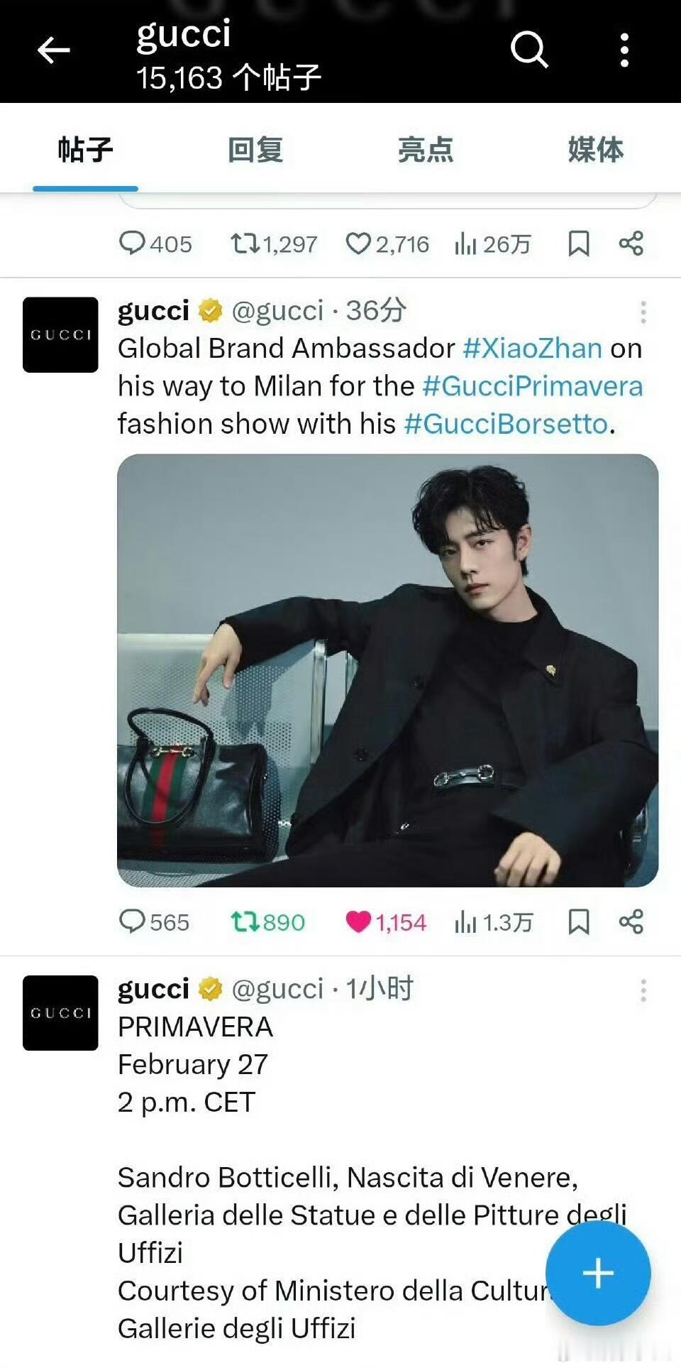 GUCCI外网首位且目前唯一官宣看秀嘉宾,同时国内官博唯一预热且置顶也是肖战😎