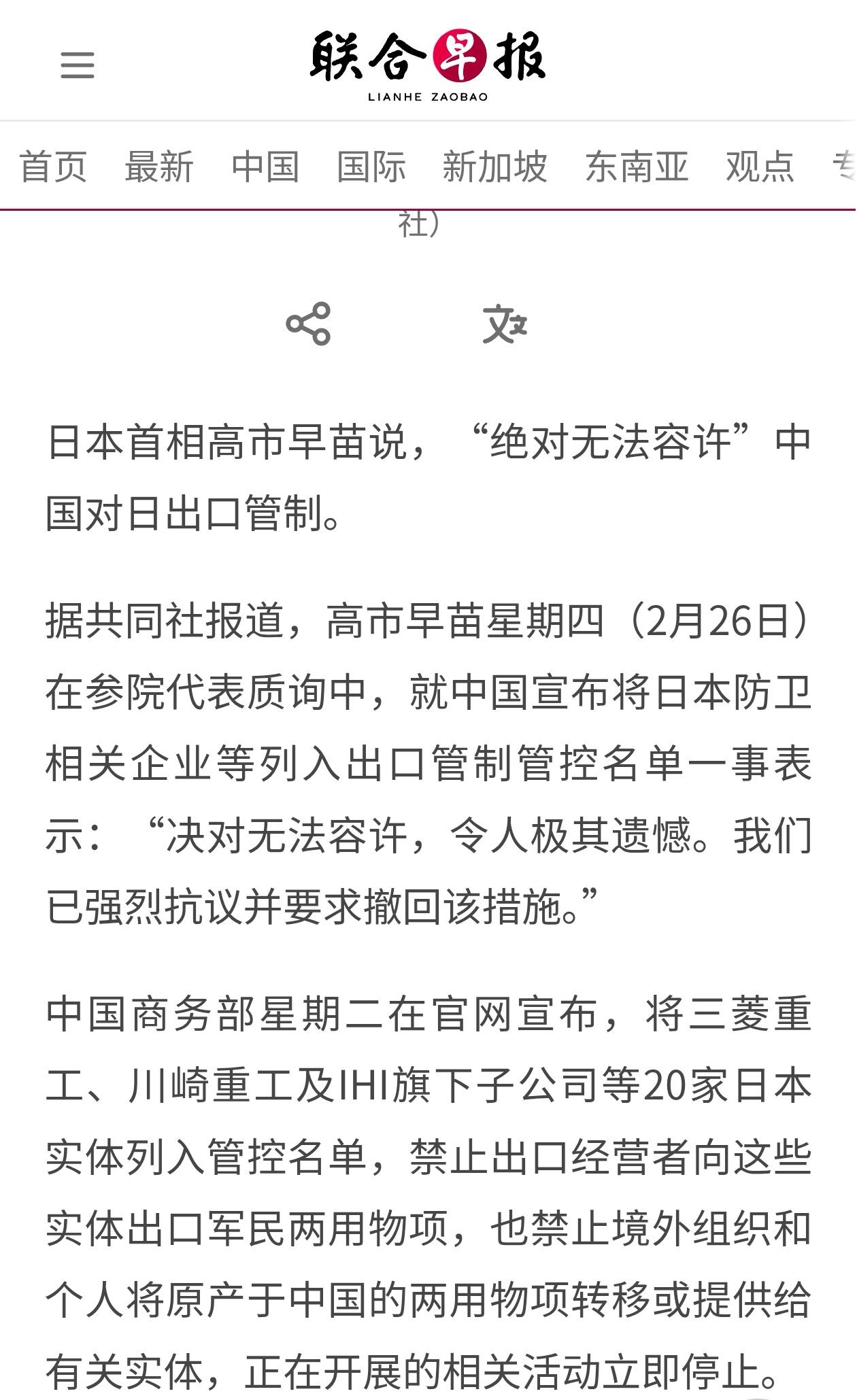 据日本共同社报道,高市早苗在今天(2月26日)参议院代表质询中,就中国宣布将日本防卫相关企业等列入出口管制管控名单一事表示:“绝对无法容许,令人极其遗憾。我们已强烈抗议并要求撤回该措施。” 在高市首相带领下,日本扩军备武加速,推动取消武器出口限制,发展进攻性军事力量,谋求修改无核三原则,再一次对地区和世界和平构成威胁,令地区国家无法容忍。中国作为负责任大国,又是联合国安理会常任理事国,制止日本“再军事化”和拥核企图,完全正当、合理、合法。高市口出狂言,声称“绝对无法容忍”,除过口嗨之外又能如何?汉奸参议员石平似乎也有话说,高市是否派出石平等议员来华申诉?