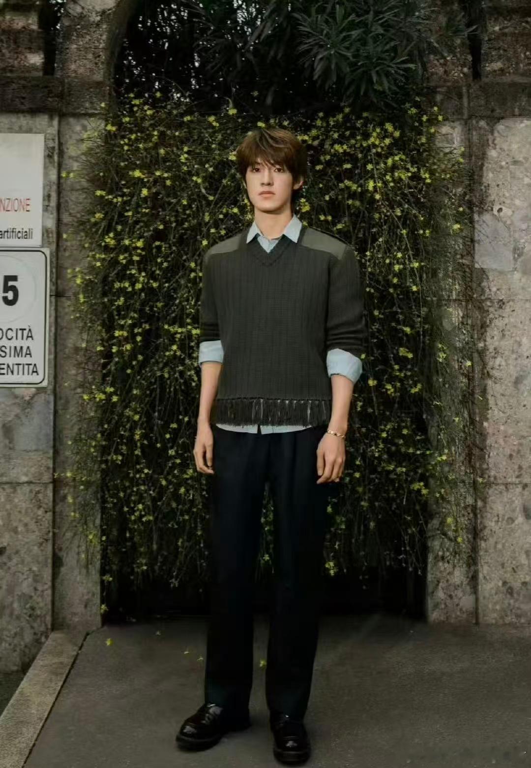 张泽禹prada看秀造型 流苏随风而动,肩章彰显态度!这套Prada造型简直是视觉盛宴,橄榄绿选得太绝了,衬得整个人清冷又贵气👏