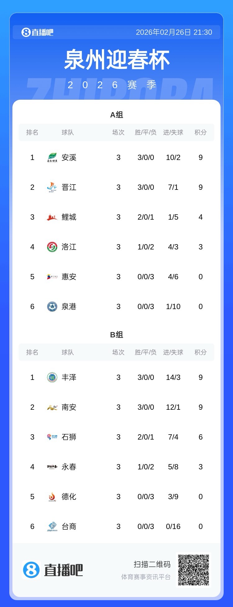 直播吧02月26日讯泉州市首届“迎春杯”足球联赛今天结束第3轮比赛的全部争夺,石狮让二追三读秒绝杀永春,南安7-0大胜台商,丰泽4-2逆转德化。本文为大家带来每场比赛的进球动图和积分榜情况。