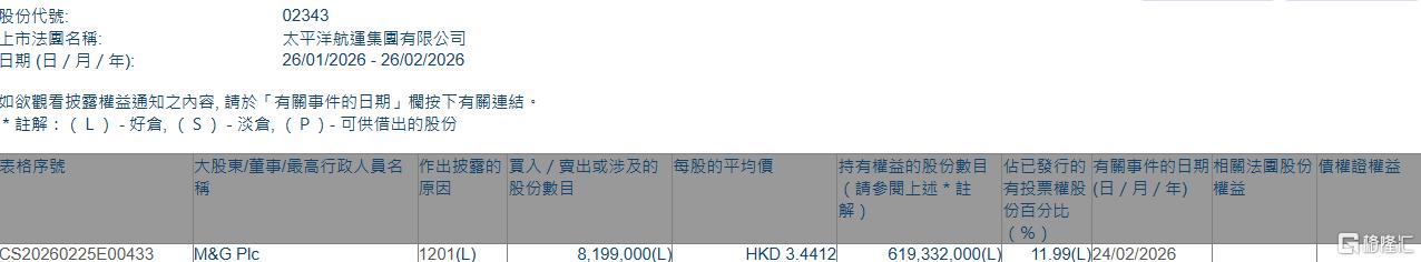 格隆汇2月26日丨根据联交所最新权益披露资料显示,2026年2月24日,太平洋航运(02343.HK)遭M&GPlc在场内以每股均价3.4412港元减持819.9万股,涉资约2821.4万港元。