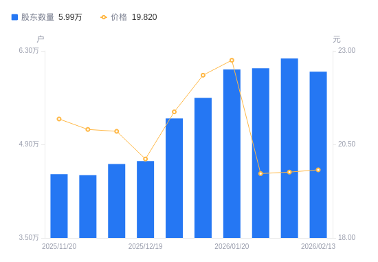 日期A股户数(户)流通A股户均持股数(股)户均持股市值(万元)2026-02-135989815318.9530.362026-02-106187814828.7629.302026-01-306040715189.8729.952026-01-206021114685.0133.412026-01-095598715792.9335.302025-12-315287816470.9135.202025-12-194649317656.0435.512025-12-104606817818.9237.152025-11-304438818493.3438.652025-11-204455618423.6139.02