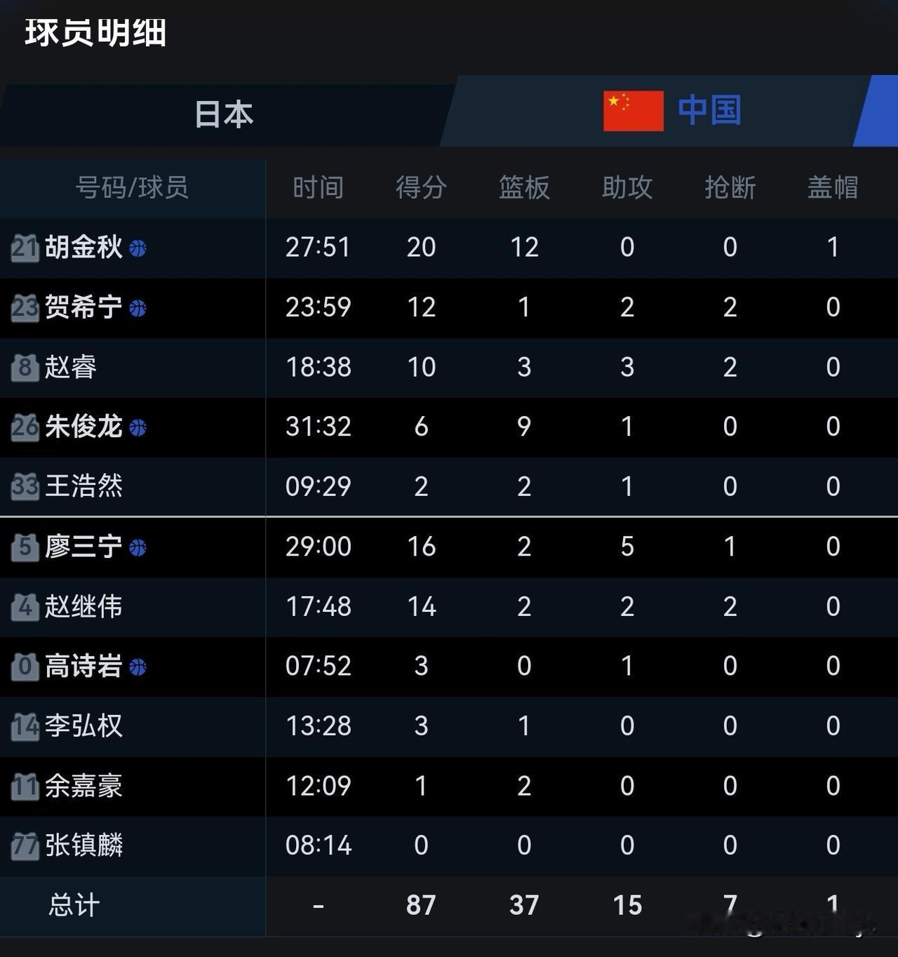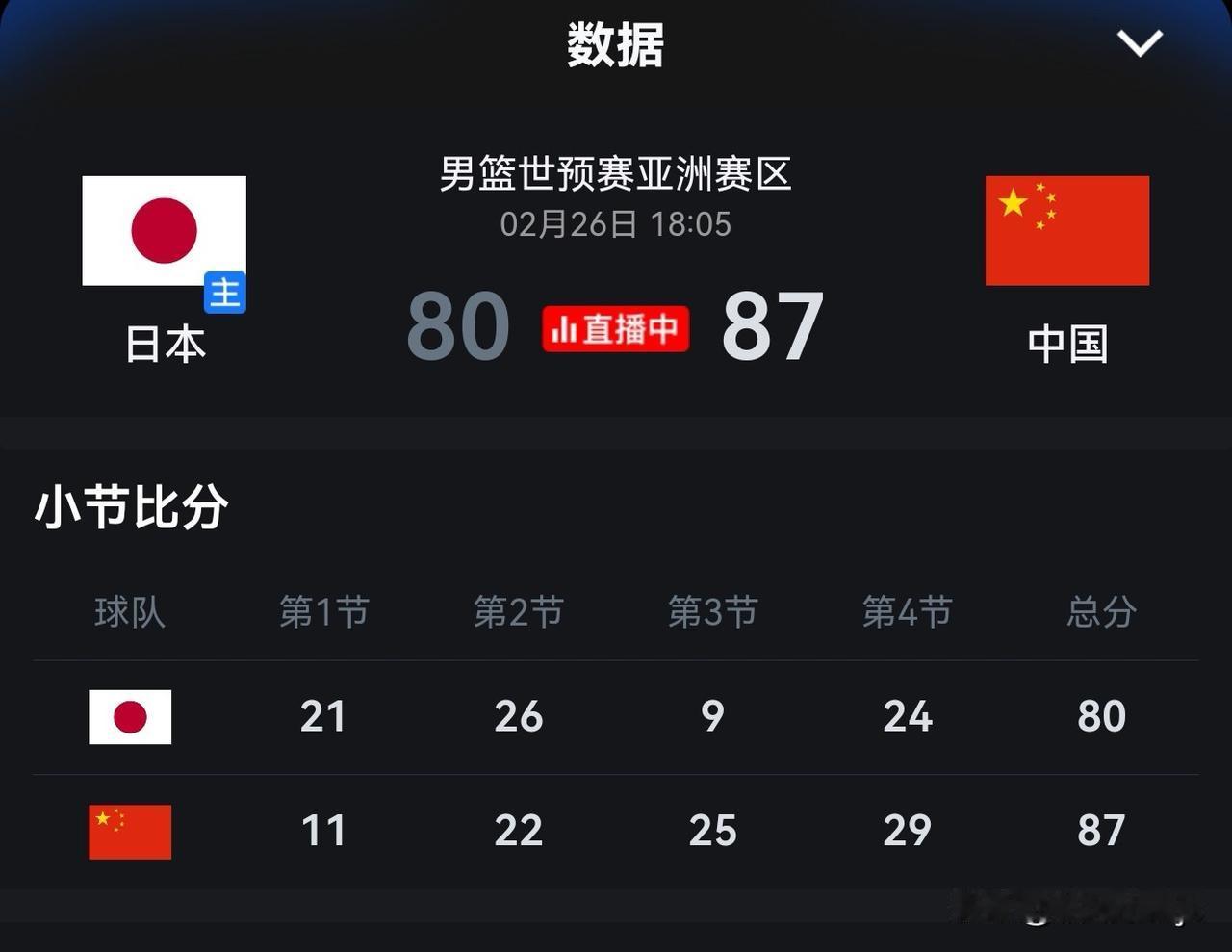 2月26日18:05,中国男篮在客场对战日本队,拼来胜果殊不易,热血男篮扬威名。 上半场,中国队开局慢热,进攻端手感冰冰凉,单节仅得11分,还被吹9次犯规,半场以33 - 47落后14分,估计不少球迷都关了直播。 但下半场,风云突变,如有神助。第三节,中国队突然发力,防守上高强度逼抢,进攻端外线苏醒,单节投进5记三分,打出25 - 9的攻势,填平分差并反超;第四节,队长赵睿5犯遗憾离场,好在胡金秋、赵继伟等球员稳住局面。 这场比赛,中国队有5人得分上双,胡金秋20分12板1帽、廖三宁16分2板5助1断、赵继伟14分2板2助2断,三分球6中3、贺希宁12分1板2助2断,三分球7中3、赵睿10分3板3助2断。 二月廿六傍晚战,男篮客场挑日本, 力克劲敌破连败,出线握掌主动权, 拼得胜利多不易,此战扬威超提气! (图片素材来自网络)