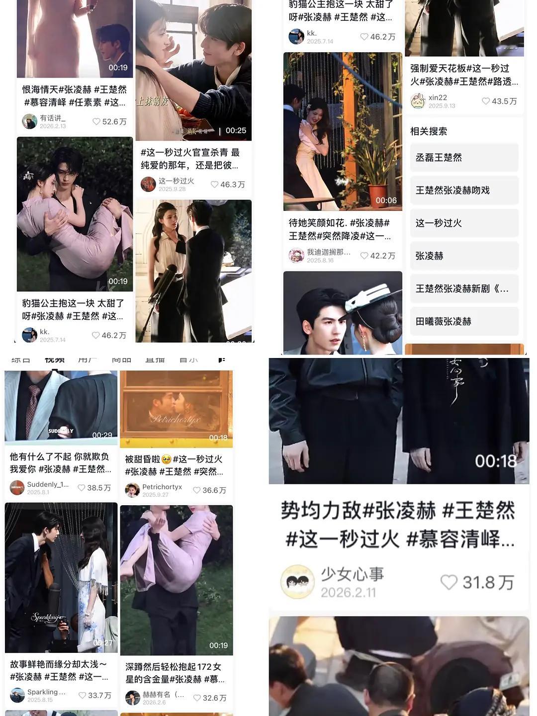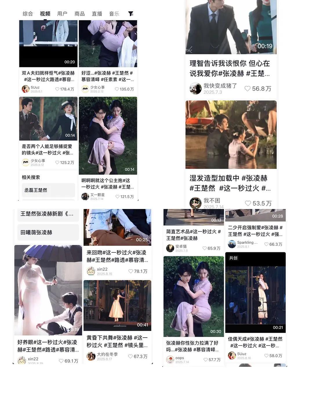 就期待这个这一秒过火🔥粗略统计带男主➕女主➕剧名标签的三十万赞以上视频有二十多个张凌赫单人路透还有个三百多万赞的 很有性张力的男帅女美
