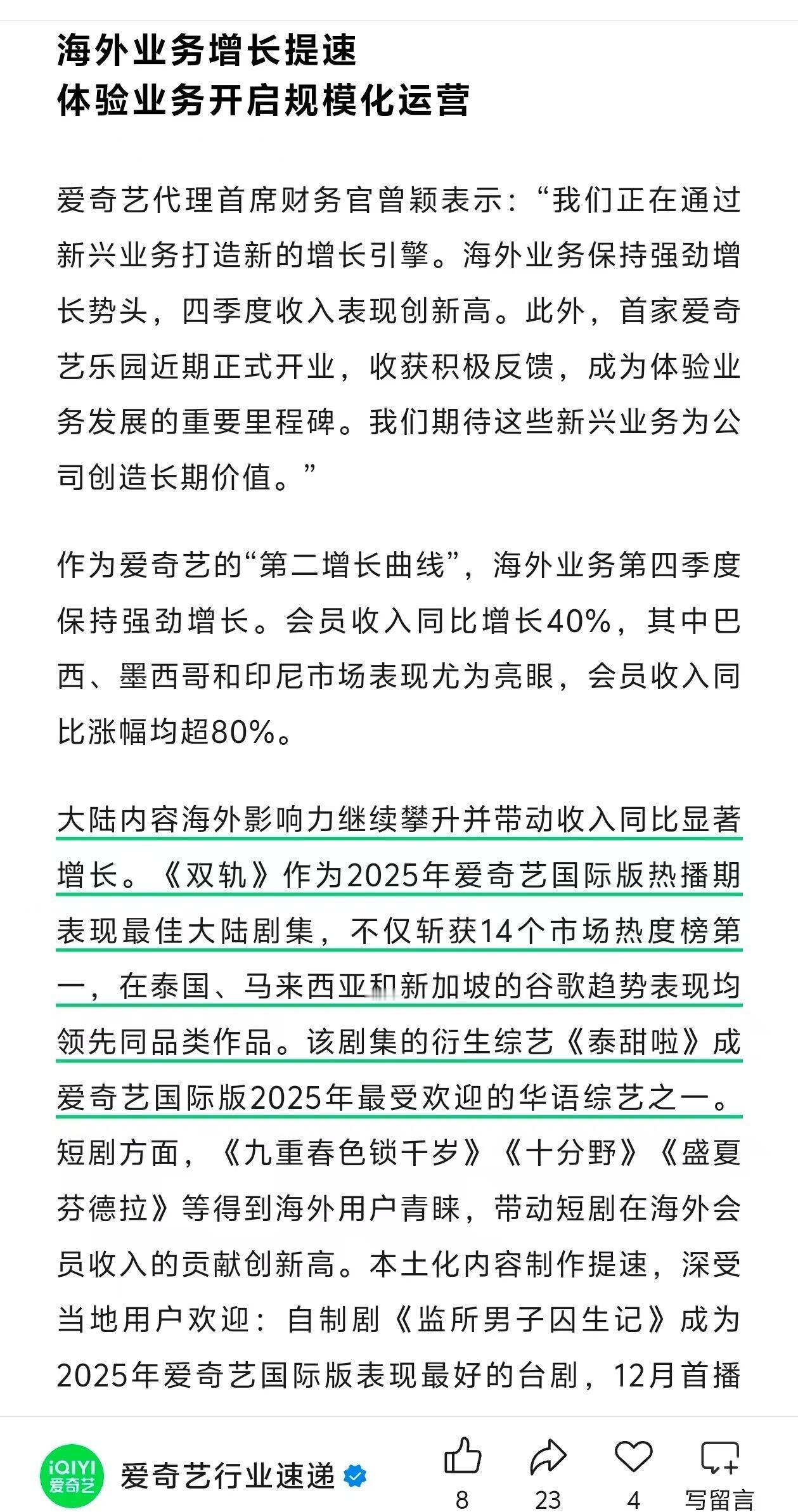 虞书欣《双轨》上了爱奇艺q4财报是海外业务唯一提到的长剧环球播出,海外大爆,赚麻