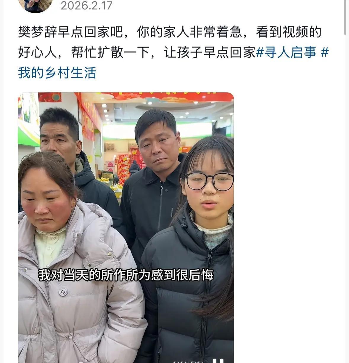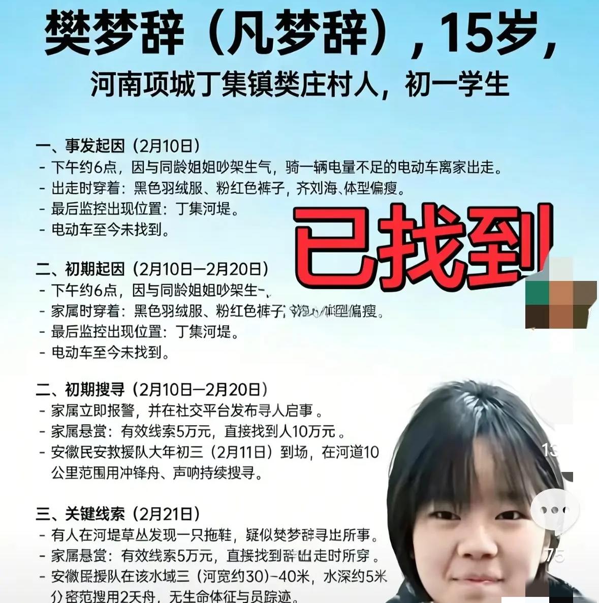 这个15岁女孩叫樊梦辞,是河南项城丁集镇人,上有姐姐下有弟弟,从小在爷奶家长大,小年那天因为跟姐姐吵架,负气骑着电动车出走,没想到这一走竟是天人之隔,悲痛的结局还是发生了。 樊梦辞在人们眼中是一个乖巧的女孩,父母在外务工,平时也是勤于家务,上初中的年纪也比较开朗。 为何在即将到来的春节,她选择离家出走呢? 原因是北方小年23那天,她与姐姐吵架了。可能是在爷奶家长大,心里比较敏感,心里有些小波动,一时解不开心里的疙瘩就骑上电动车出了家门。 当天天已黑,还迟迟未见她回家,于是选择了寻找,直至第二天寻找无果,家人果断报警。 经过翻看录像,她出现在丁集的河道边上,再查看也寻找不到她的身影。 家人很是着急,先是把悬赏金额定到了五万,经过10天左右的救援,终于发现了她离家时穿的一只拖鞋。 悬赏金额从五万涨到了百万,可是坏消息还是传来。 2月26日,距离河道下游12公里处找到了她,此时的她已经没有了生命体征,离开了人世。 几句争吵,花一样的年纪就此凋谢。 她本该有更加美好的人生,却因为争吵后一时想不开,心里发生了波动,也可能是长期因为在爷奶家成长,与姐弟之间出现了间隙,所以把自己留在了冰冷的冬天。 家人之间,总归有意见不一的时候,这个时候就需要彼此冷静一下,然后再进行沟通,把矛盾化解了,没有什么大不了的。 看着照片真的是一个挺漂亮的小女孩,一时钻了牛角尖真的是太可惜了,现在后悔的应该数她的姐姐和妈妈吧,姐姐说不该跟妹妹吵架,妈妈说不该打骂她,可惜这一切都晚了。 孩子们啊,真的不要因为一点小事,就用做傻事惩罚自己,一定要好好的爱惜自己的生命啊!