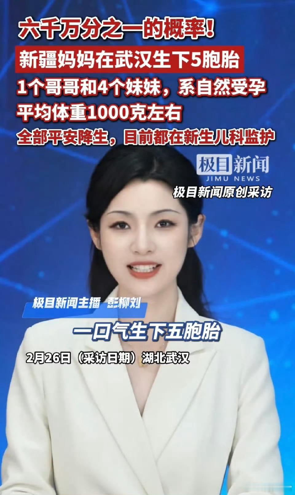 24岁女生成功诞下1男4女5胞胎今日凌晨3时许,一位来自新疆的24岁产妇在武汉成功分娩五胞胎。医学数据显示,全球自然受孕五胞胎的出生概率仅为6000万分之一,堪称生命的极致奇迹。