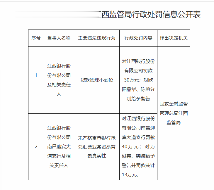 国家金融监督管理总局江西监管局披露信息显示,因存在贷款管理不到位问题,对江西银行处以罚款30万元,对涉事责任人欧阳某华和陈某分别处以警告。