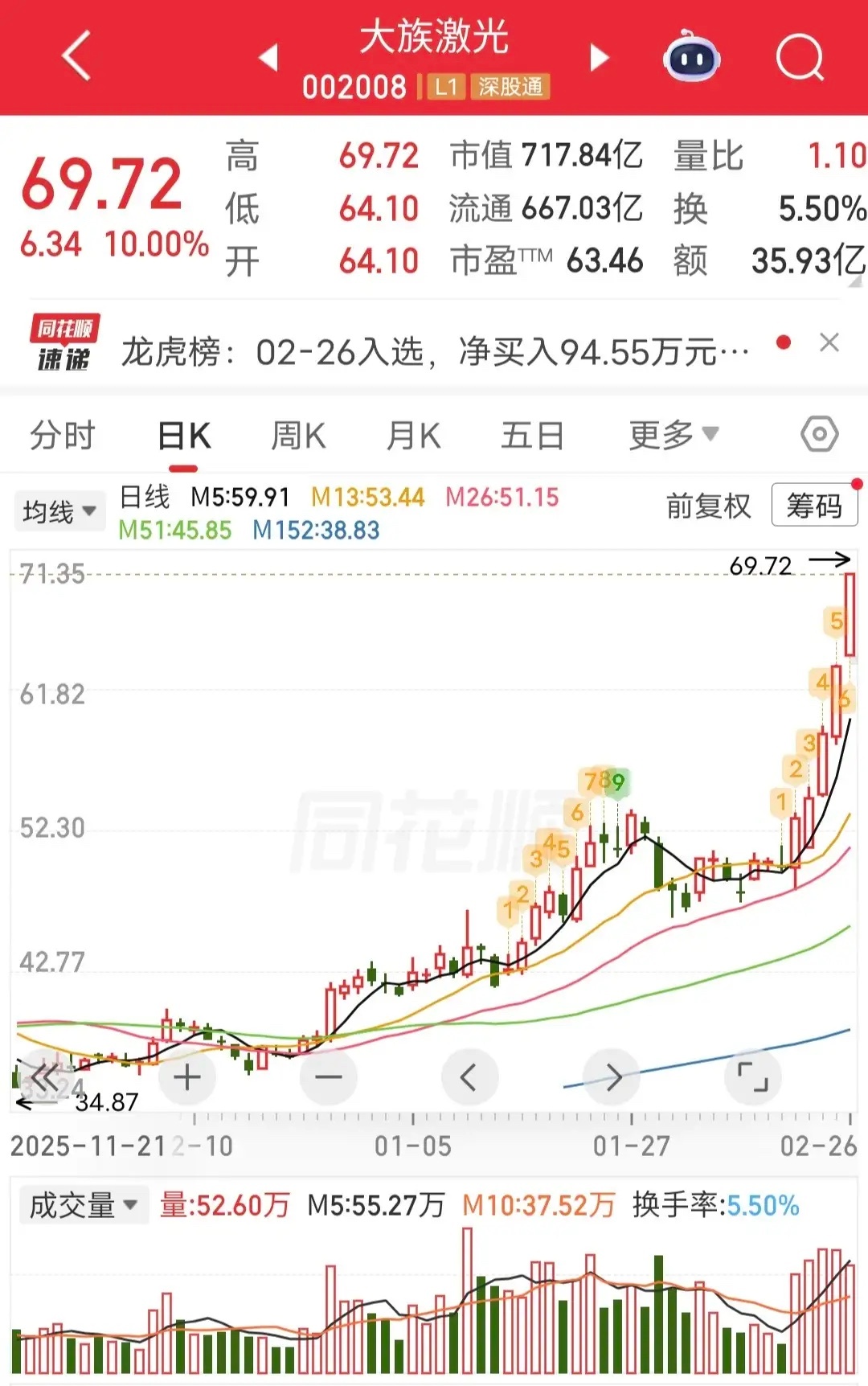 小鳄鱼爆买3个亿:今天大族激光盘中涨停。盘后龙虎榜显示,小鳄鱼三个交易日爆买3个