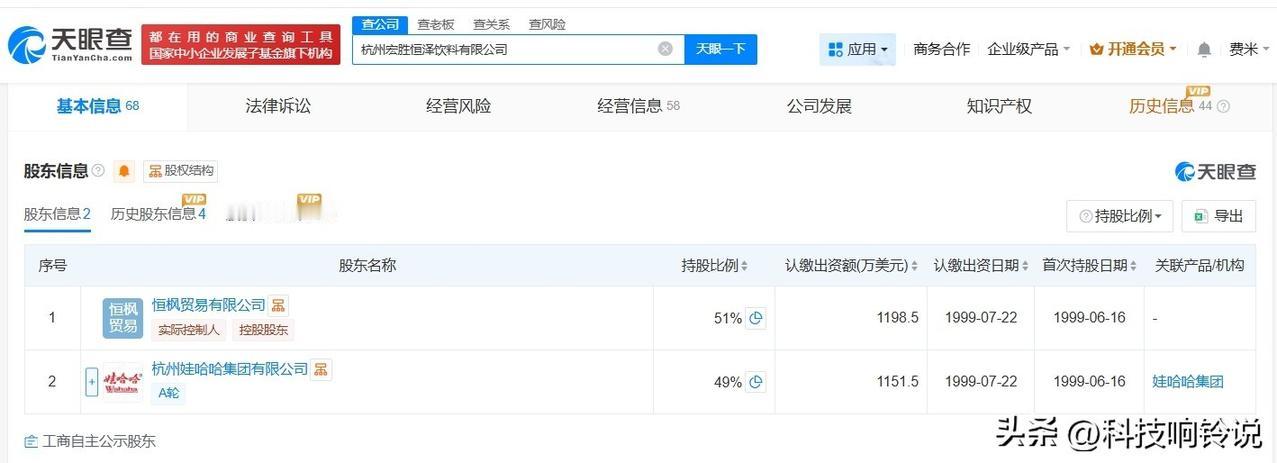 【许思敏接手杭州宏胜恒泽饮料公司 宗馥莉退出】 天眼查App显示,近日,杭州宏胜恒泽饮料有限公司发生工商变更,祝丽丹卸任法定代表人、经理,宗馥莉卸任董事,许思敏接任法定代表人、董事、经理。 该公司成立于1999年6月,注册资本2350万美元,经营范围为生产销售食品和饮料,由恒枫贸易有限公司、杭州娃哈哈集团有限公司共同持股。 天眼查信息: