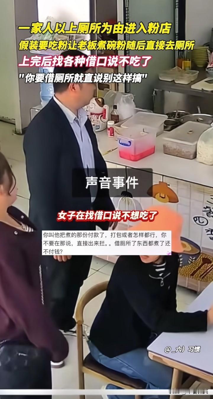 缺德!2月23日,贵州一家人去一家粉店,点了碗粉然后去了厕所,等上完厕所,却找借口说不想吃了!但老板娘已经下了一大锅粉! 老板娘也看出了端倪,直言:你要借厕所就直说,别这样搞! 说实话,你要直接去商家上厕所,很多商家不是太愿意,但可以跟商家沟通一下:老板娘,我想借用你家的厕所,给你1块钱可以吗? 商家同意你就上,不同意可以再加点钱对吧!没必要借“吃粉”的理由去上厕所,粉都下好了你又不吃了,商家的损失太大了!