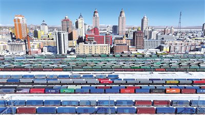 2月26日,中欧班列在中国铁路哈尔滨局集团有限公司满洲里站等待出境发车(无人机照片)。截至2月26日,2026年以来经中欧班列东通道进出境的中欧班列总数达1034列,运输货物105170标箱,较2025年提前26天突破1000列大关。中欧班列东通道由满洲里、绥芬河、同江铁路口岸组成,目前有27条班列通行线路,覆盖波兰、德国、荷兰等14个国家,联通国内长沙、郑州、成都等60余个城市。