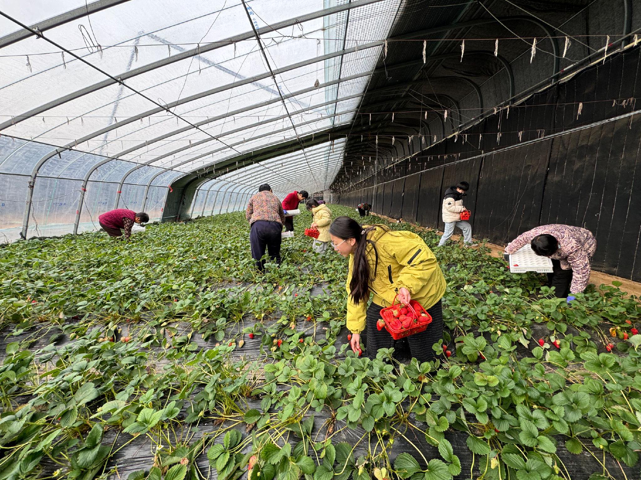 近日,在河北省无极县西牛村生态农业示范园的大棚内,饱满红艳的草莓掩映在绿叶间。棚间管理采用昆虫授粉、有机肥替代化肥等绿色种植模式,提升了果实品质。春节期间,石家庄市生态环境局无极县分局工作人员来到园内,实地了解环境状况,为生态农业高质量发展保驾护航。图为游客在生态农业示范园采摘草莓。