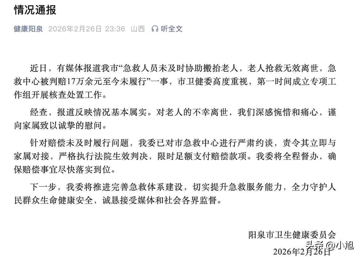 心里发凉!山西阳泉一个85岁的老太太,深夜胸口憋得慌,家里人赶紧打了急救电话。医生护士10分钟就到了,人也检查了,心电图也做了,老太太当时还挺清醒,自己张罗着让保姆拿医保卡、身份证,准备去医院。 谁能想到,这之后就卡住了,整整卡了40分钟。 卡在哪儿?就卡在没人抬她下楼这件事上。老太太住5楼,老小区没电梯,女婿和50多岁的保姆两个人弄不了。家属就跟现场的医生护士商量,说咱们这儿有医生、有护士、有司机,加上我俩五个人呢,搭把手把老人抬下去,也就10分钟的事。 可人家医护人员就是不干,说这不是他们的活儿,让家属自己找人,或者打110找警察帮忙。女儿在太原往回赶的路上,急得在电话里求他们,说事后一定重谢,还是没用。 就这么着,从晚上10点49分医生进门,到11点半左右老人病情突然恶化、脸都青紫了,这40分钟里,人就一直躺在5楼的床上干等着。 有个细节特别戳人。聊天记录显示,晚上10点58分,也就是医生到了快10分钟后,老太太自己还强撑着身体给亲戚打电话求助。85岁的老人,半夜三更,胸口憋得难受,还得亲自打电话求人来抬自己。这电话没打通。 最后眼看着不行了,那个男医生才和女婿一起把老人往下抬。送医院也就4分钟车程,可人已经不行了,凌晨2点多宣告死亡。 这事儿最让人接受不了的是什么?是后来家属看到那份心电图报告,上面明明白白写着"极度心动过缓"。可当时女儿在电话里问情况,医护人员还说血压、心电图都"稳定"。除了吊了点儿盐水,什么急救药都没用。 法院委托做的司法鉴定把这事儿说得很清楚。鉴定报告指出急救中心有三项核心过错:第一,这种症状得监护、得用药,都没做;第二,危重病人不及时搬运,耽误了40分钟;第三,后来在车上做心肺复苏,动作不规范,气道没打开,该用的药也没用。 可急救中心事后怎么解释的?人家拿出来规定,说自己只配了医生护士司机,没有担架员,法律上就没规定他们必须干搬抬的活儿。那天最后帮忙抬了,那是"情分",不是本分。 这话听着冷冰冰的,但好像还真是他们内部的规定。 法院没吃这套,一审二审都判了,急救中心赔17万多。法官说得在理,院前急救,首要任务就是赶紧把病人弄到医院去。你人到现场了,因为没人抬就让病人干等40分钟,这背离了救死扶伤的宗旨,老百姓接受不了。 事情到这儿还没完。判决下来好几个月了,家属说钱一直没拿到。直到这两天媒体报道了,阳泉市卫健委才赶紧发通报,说情况属实,已经约谈了急救中心,责令他们马上执行判决,把钱赔了。 这事的焦点其实早就不是该不该赔钱了。而是那个晚上,在5楼的那间屋子里,到底发生了什么。 急救中心的工作人员后来接受采访时说了句话挺实在:"病人加担架一百多斤,楼层搬运不比平地,还怕摔落,最少需要4人配合"。可问题是,那天现场明明有医生、护士、司机、女婿、保姆,五个人,怎么就凑不出这四个人? 他们还说,急救行业人员紧缺,配不起担架员。早在这事儿发生前几年,他们就多次提过要配人,一直没落实。以山东德州为例,测算下来配齐担架员每年要投2000多万,很多地方拿不出这个钱。 钱的问题,最后让一个85岁的老太太用命来扛。 老太太临死前那一刻的感受,没人能说得清。她本来收拾好了东西,以为医生来了就有救了,结果就躺在自己床上,听着身边的大人为"该谁抬她下楼"在那儿掰扯、打电话找人,一等就是40分钟。 那种眼睁睁看着希望一点点流走的绝望,没法想。 这事儿说到底,是制度在要人命。大家都知道应该配担架员,可钱从哪来一直没解决。结果就把这个难题甩给了老百姓,甩给了那个深夜里喘不上气的老人。 你说是医生的错吗?人家手里拿着规定,说没义务。可对躺在床上的人来说,管你什么规定,管你情分本分,命没了就什么都没了。 好在现在官方表态了,责令赔偿,也要推进完善急救体系。但这话来得有点晚,晚了一个85岁老人的命。 你们说,这事儿要是换你摊上,该怎么办?