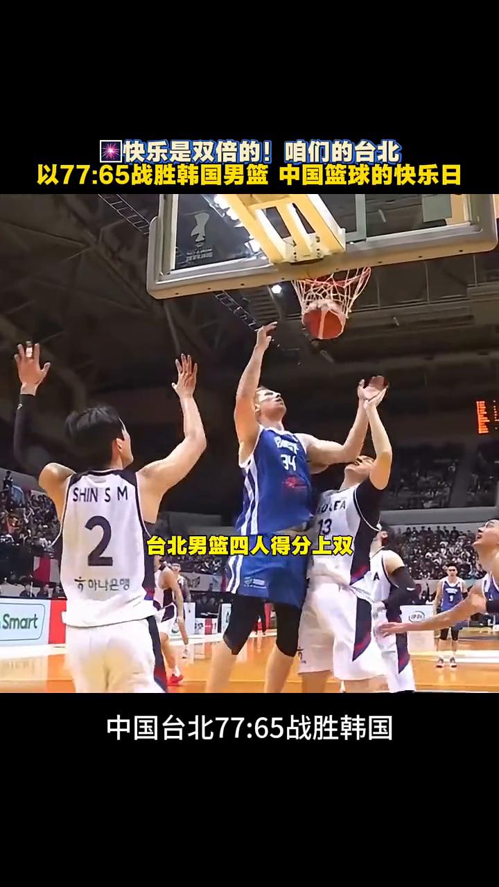 快乐是双倍的!咱们的台北以77:65战胜韩国男篮,中国篮球的快乐日。 今晚真是双喜临门,省队居然把韩国给赢了。是预赛中国台北与韩国的比赛中,台北男篮四人得分上双,攻防平衡。最终中国台北男篮77:65爆冷战胜韩国男篮,收获小组赛首胜。韩国男篮遭遇小组赛首败,又是赢日本,又是赢韩国的中国篮球的解气之日,开心是双倍的。