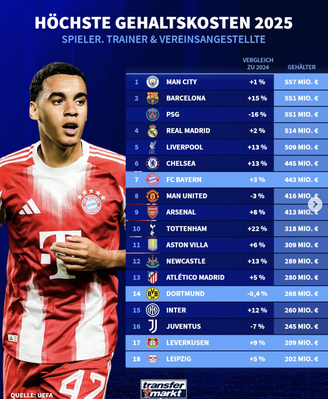 虎扑02月27日讯欧足联近日发布了《欧洲俱乐部财务与投资格局》报告,对欧洲足坛的整体财政状况与投资趋势进行了系统梳理。德转统计了2025年球队工资总支出(含球员、教练和工作人员)。