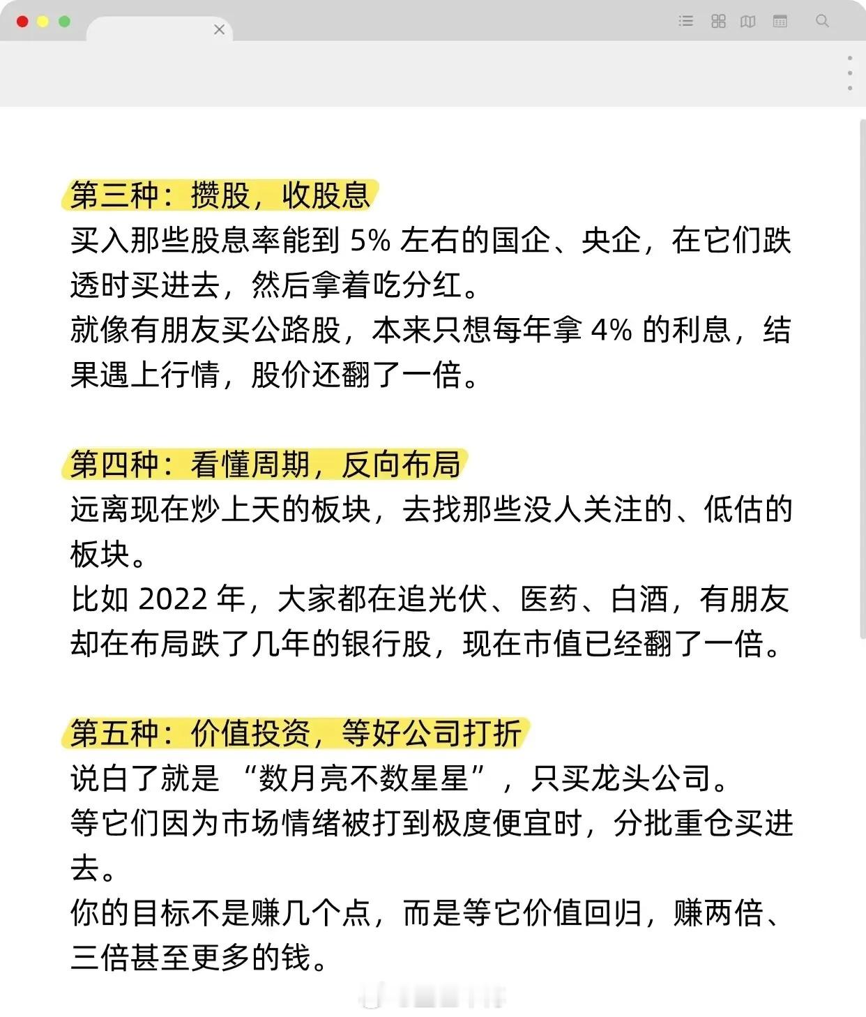 1. 等大跌,买指数平时不用操作,只用闲钱等待“股灾式”大跌(如24年9月、25年4月),然后买入宽基ETF,靠市场反弹赚取收益(如30%),无需选股。2. 专注一两只股票,反复做波段精选一两只优质股,保留现金,通过“涨卖跌买”来回操作,不断降低持仓成本,理想目标是将成本做成负数。3. 攒股,收股息买入股息率约5%的国企或央企股票,在股价低迷时入手并长期持有,主要赚取稳定分红,同时博取股价上涨的资本利得。4. 看懂周期,反向布局避开市场热门板块,寻找被低估的冷门板块(如2022年的银行股)进行逆向投资,等待板块轮动和价值回归。5. 价值投资,等好公司打折只买行业龙头公司(“数月亮”),在市场情绪低迷、价格极度便宜时分批重仓买入,长期持有,等待其价值回归并获取数倍回报。6. 赚企业成长的钱投资市值小、前景好、未来有巨大增长潜力的公司(“数星星”),这需要对行业有深刻理解,是难度最高的一条路径。