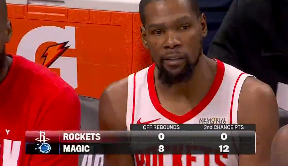 比赛的第二节,转播画面给出一组数据,火箭首节进攻篮板0-8,二次进攻得分0-12被魔术碾压。
