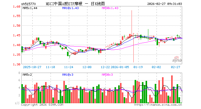 2月27日,MSCI中国A股ETF摩根(515770)开盘跌0.69%,报1.433元。MSCI中国A股ETF摩根(515770)重仓股方面,贵州茅台开盘涨0.05%,宁德时代涨0.32%,招商银行涨0.13%,工业富联跌2.85%,中国平安涨0.16%,紫金矿业跌0.43%,中际旭创跌3.01%,长江电力涨0.04%,农业银行涨0.00%,寒武纪跌2.03%。