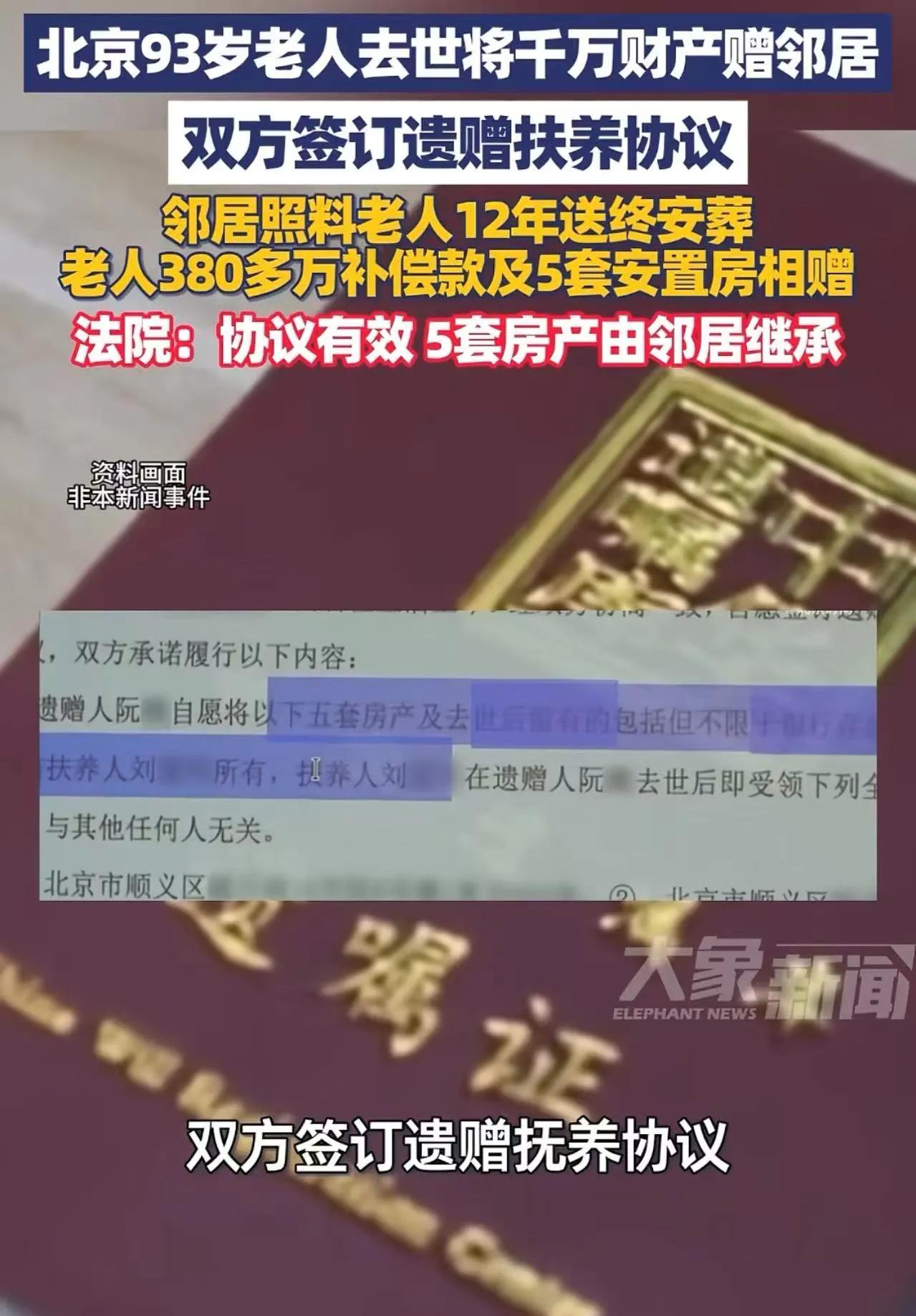 北京,93岁老人去世将千万财产赠邻居!四个哥哥和一个妹妹目瞪口呆!本来他们想着吃“绝户”,结果到嘴的肥肉居然就这样没了!法院:协议有效,5套房产由邻居继承!网友:这样的北京大爷还有吗? 93岁的阮大爷走了。走得很安详。他一辈子无儿无女,但有四个哥哥、一个妹妹。 阮大爷在北京的老村里住了一辈子,亲戚们住得不算远,可平日里来往却淡得很。逢年过节见上一面,客套话聊几句,转头就各过各的,老人的日常起居,从来都是自己扛。身边的邻居刘某看在眼里,打2011年起,就主动搭把手照顾老人,买菜做饭、看病拿药、修修补补,十二年如一日,把阮大爷当成自家老人对待。 村委会看在眼里,出面协调让两人签了遗赠扶养协议,白纸黑字写清,刘某负责阮大爷的生养死葬,老人百年后财产归刘某所有。后来村里拆迁,阮大爷分了五套安置房和三百八十多万补偿款,身家上千万,他又在律师见证下重新签了协议,把所有财产都留给了刘某。 这边刘某尽心尽力伺候,那边阮大爷的哥哥妹妹们却打着小算盘。他们觉得阮大爷无儿无女,就是民间说的“绝户”,等老人走了,财产自然该归他们这些血亲,早就私下里盘算着怎么分房子分钱,连后续的安排都想好了。 阮大爷去世后,刘某按规矩操办了后事,可亲戚们一听说财产都给了邻居,当场就炸了锅,死活不认这份协议,觉得外人凭什么拿自家的财产。双方闹到法院,法官走访了村委会、街坊邻居,核实了刘某十二年照顾的实情,也确认了协议是阮大爷的真实意愿,最终判协议有效,五套房产全归刘某。 这事儿最让人感慨的,就是那点凉透的亲情和滚烫的邻里情。所谓的血亲,想着的只是老人的财产,等着“吃绝户”,这是流传了上百年的封建陋习,都新时代了,还抱着“无儿无女财产就该归亲戚”的想法,殊不知亲情从来不是靠血缘绑着,而是靠真心换真心。反观邻居刘某,不图名不图利,十二年的付出全是真情,这份照料,比那些只盯着财产的亲戚靠谱百倍。 法律也早把道理说清了,《民法典》里的遗赠扶养协议,就是给孤寡老人的保障,你对老人尽了扶养义务,就该享有受遗赠的权利。那些想着坐享其成的亲戚,既没尽过赡养的责任,又想分遗产,天底下哪有这样的好事。 说到底,财产是老人的,他想留给谁,都是自己的自由。比起冰冷的血缘,老人更在意的,是晚年那些有人陪伴、有人照顾的温暖日子。刘某的付出,配得上这份回报,而那些算计“绝户”财产的亲戚,最后落得竹篮打水一场空,也是活该。 各位读者你们怎么看?欢迎在评论区讨论。