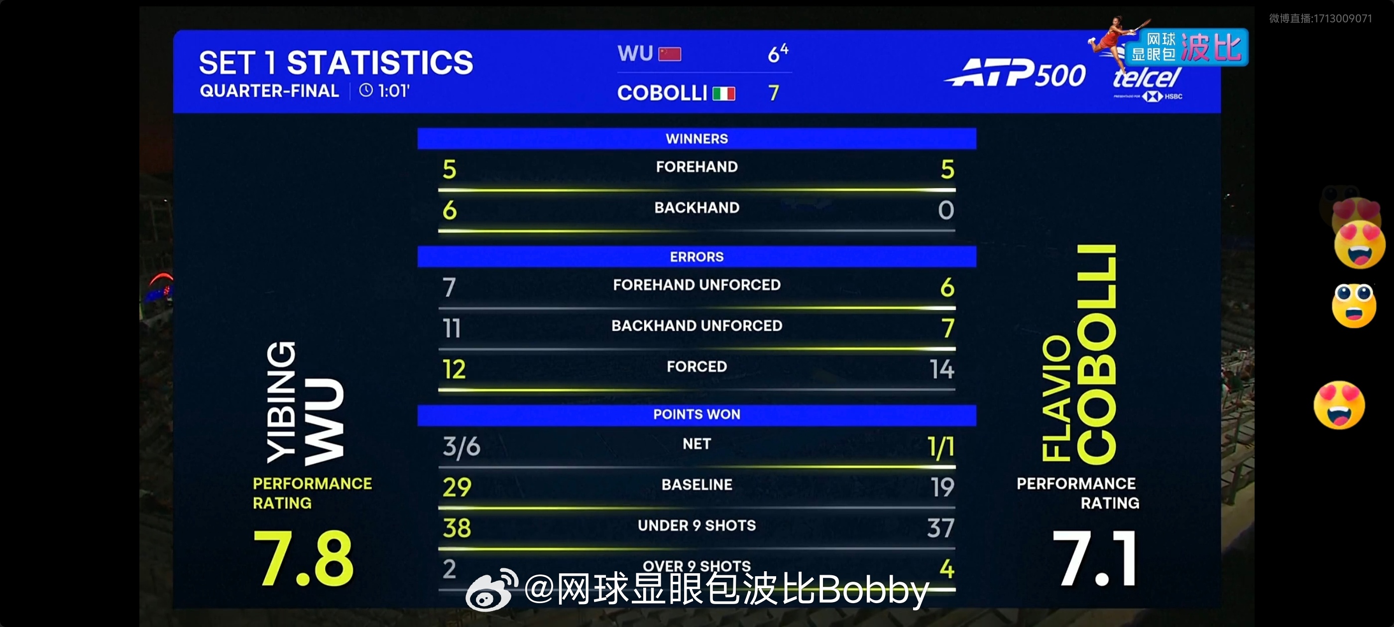 第一盘技术统计,吴易昺更加强势,11个制胜分,但是失误也很多,科博利防守给吴易昺很大压力…
