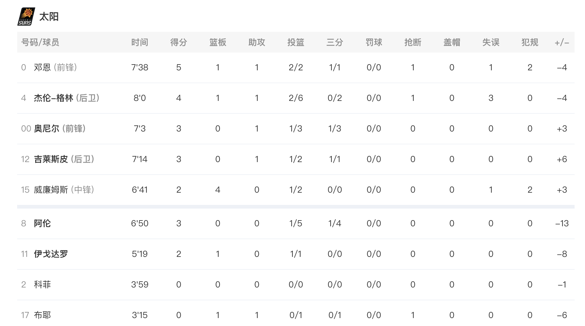 詹姆斯5分1篮板1助攻,东契奇12分2篮板2抢断,里夫斯2分2助攻,肯纳德4分2篮板,海斯2分4篮板,拉拉维亚2分2篮板。