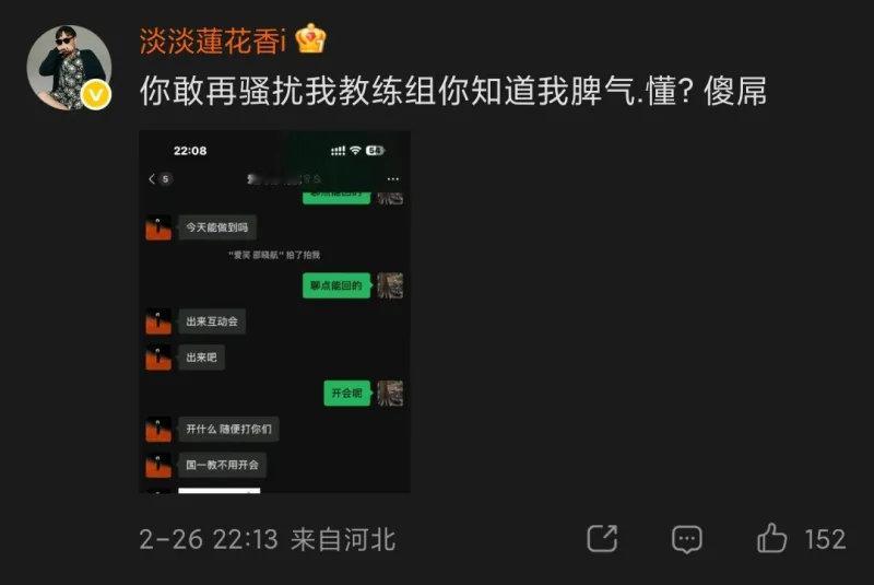 爆了!昨日JDG力克AL挺进胜决后,JDG老板评论AL经理爱笑,具体内容如下:JDG老板:你敢再骚扰我教练组你知道我脾气.懂?(并贴出了疑似爱笑与JDG分析师家子正的聊天记录)