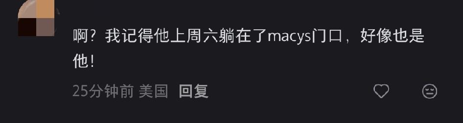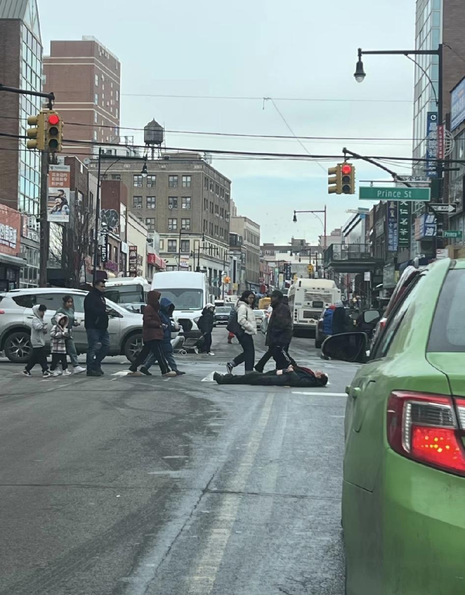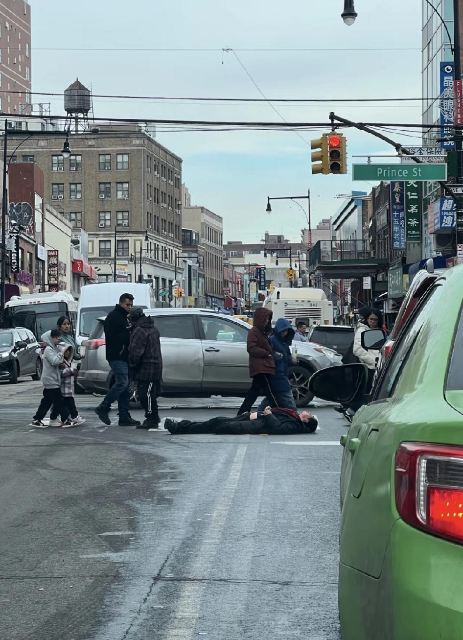 纽约街头一景,人行横道的路人和过路口的车从躺着的人身边过去,顶多也就是多看两眼。 有多个美国IP网友说近期曾在不同的地点见到这个人躺在地上。 不排除是行为艺术或真的生病了,但视频里并没有人跑过去帮助他(她),大家都在按部就班继续自己的生活。
