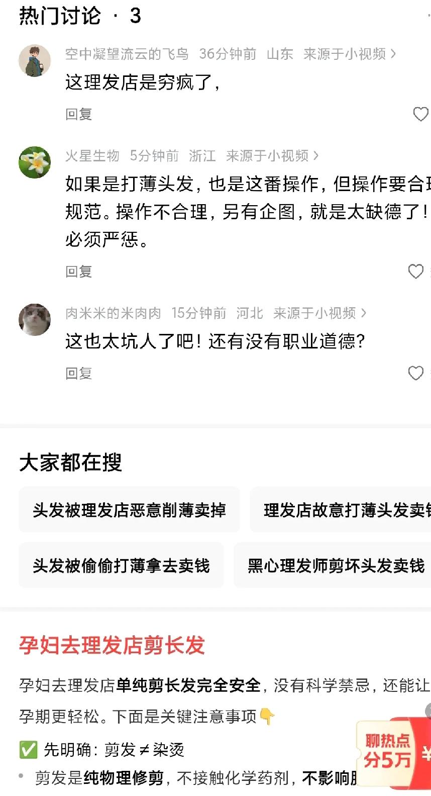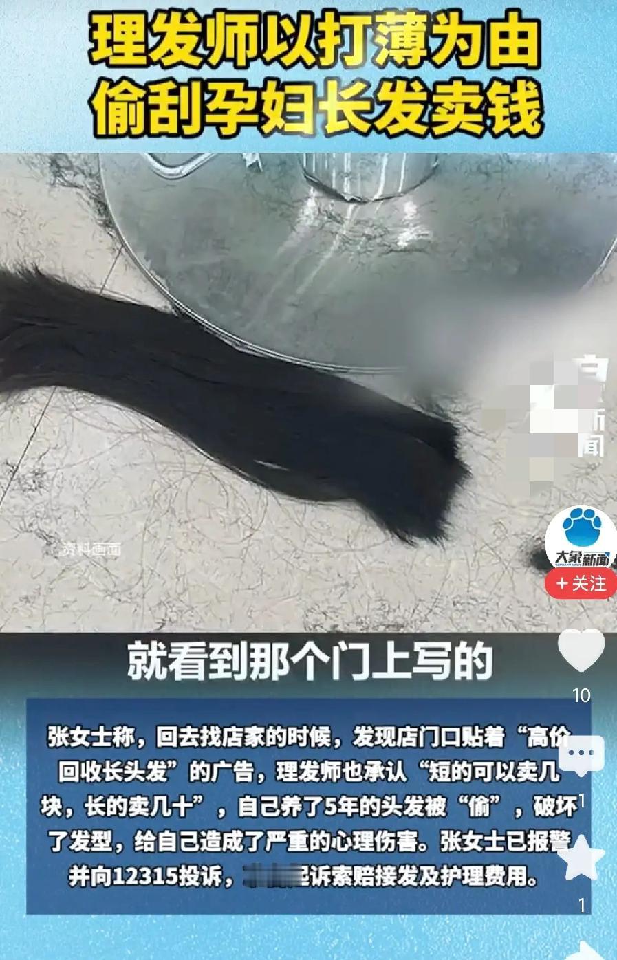 孕妇理发变“秃”然袭击!理发师借打薄偷刮长发卖钱,这一刀割碎了谁的信任? 见过理发师手抖剪坏刘海的,也见过托尼老师强行推销办卡的,但你绝对没见过心黑到直接“偷头”卖的。近日,河南驻马店发生的一起离谱事件,彻底刷新了人们对服务行业下限的认知:一位怀孕五个月的准妈妈,本想简单做个软发,结果却被理发师以“打薄”为名,用刀片贴着头皮将那一头精心养护五年的长发刮得所剩无几。更令人细思极恐的是,地上那堆被刮下的头发,竟被整整齐齐捆扎好,宛如菜市场待售的韭菜,只等转身变现。 事情发生在驻马店的一家普通理发店。顾客张女士挺着孕肚走进店内,只想让厚重的头发稍微清爽一些。面对孕妇的特殊情况,理发师并没有表现出应有的谨慎与关怀,反而一脸“为你好”地建议:“孕期别折腾烫染,我给你打薄一下就行,既轻松又安全。”出于对专业人士的信任,加上身体不便多言,张女士便低头玩起了手机,任由那把冰冷的刀片在自己头顶飞舞。 然而,当服务结束,张女士抬头看向镜子的那一刻,整个人都僵住了。镜中的自己头发稀疏凌乱,而地上的落发数量之多,甚至超过了头上剩余的存量。最诡异的细节在于,这些被刮下的头发并非杂乱无章,而是被理发师极其专业地一捆捆码放整齐,长短一致,光泽度极佳。这一幕,像极了农民收割成熟的庄稼,只不过这次被收割的,是顾客视若珍宝的长发。 张女士心中疑窦丛生,回家后立即咨询了从事美发行业的弟弟。弟弟一眼便看出了门道,拍着大腿惊呼:“姐,你这是被‘收割’了!”原来,在美发圈的灰色地带,优质长发有着明确的市场行情。短的碎发可能只值几块钱,但这种长度统一、发质完好的长发,回收价格高达几十甚至上百元一斤。 带着愤怒与质疑,张女士返回店家讨要说法。刚到门口,一块赫然张贴的“高价回收长头发”招牌映入眼帘,仿佛在无声地嘲笑着她的天真。面对对质,这位理发师倒是“坦荡”,直接承认了将刮下的头发收集起来售卖的事实,言语间毫无愧色,仿佛这只是行业内的潜规则,而非盗窃行为。 这哪里还是提供美学服务的理发店?这分明就是一个隐蔽的“韭菜种植基地”。在这里,顾客不再是上帝,而是待割的韭菜;手中的剪刀和刀片不再是造型工具,而是敛财的镰刀。理发师利用信息差,打着“打薄”的幌子,行“偷刮”之实。他们深知,贴头皮刮下来的头发长度统一、卖相最好,最能卖出高价。至于顾客的发型是否美观、心理是否受伤,在他们眼中远不如那几百元的卖发钱重要。 张女士那头养了五年的长发,承载着一位母亲对美的追求和对生活的热爱,却在短短五分钟内,沦为理发师口袋里的私房钱。这种行为,表面看是贪小便宜,本质上是对消费者人格的极度蔑视和信任的肆意践踏。它暴露出部分从业者在利益面前道德底线的全面崩塌:你以为他在为你设计形象,其实他正在心里盘算你的脑袋能换多少现金。 近年来,理发行业的乱象层出不穷:办卡后老板跑路、洗个头推销半小时、剪坏了推卸责任……但“偷头发卖钱”这一操作,无疑是将恶劣程度推向了新的高峰。尤其是受害者还是一位孕妇,本该得到社会更多关爱与呵护的群体,却在消费过程中遭遇了如此冷血的“算计”,这不仅让人寒心,更让人愤怒。 目前,张女士已选择报警并准备提起诉讼,要求店家按照接发的市场价格进行赔偿。这一诉求合情合理,更是对不法行为的有力回击。我们期待法律能给出一记响亮的耳光,让这位“手法娴熟”的理发师明白,消费者的脑袋不是自留地,想割就割的时代已经过去了。 此事也应成为整个行业的警钟。如果连最基本的诚信都无法守住,再高超的剪发技巧也只是助纣为虐的工具。建议相关部门加强监管,同时也呼吁广大消费者提高警惕:今后进入理发店,不妨先问一句“是否回收头发”,若遇“打薄”服务,务必全程睁大眼睛,甚至要求“先称重、后动刀”。毕竟,在这个套路满满的世界里,守护好自己的头发,就是守护住最后的尊严。理发店偷头发 女孩理发 理发师打薄剪 素材来源:大象新闻