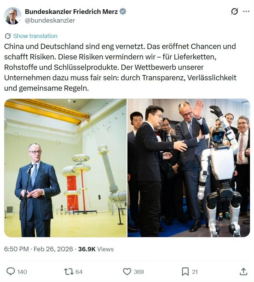 默茨的表述,是在东大与M国博弈及D国内部博弈间走钢丝的“平衡术”。他用“降低供应链风险”“公平竞争”等契合M国“政治正确”的话术,安抚西方阵营与D国国内鹰派,规避立场争议;同时,他率庞大企业代表团访向东大、强调双方合作的不可替代性,核心是维护D国经济利益,对冲M国要求欧洲牺牲自身利益服务其地缘战略的诉求。这并非彻底脱离M国或全面转向东大国,而是以M国能接受的表述,包装D国务实的对外合作政策,在“安全依托M国、经济绑定东大”的框架下,为D国及欧洲争取更大战略自主。 但感觉其底色还是“既要…又要…还要…”