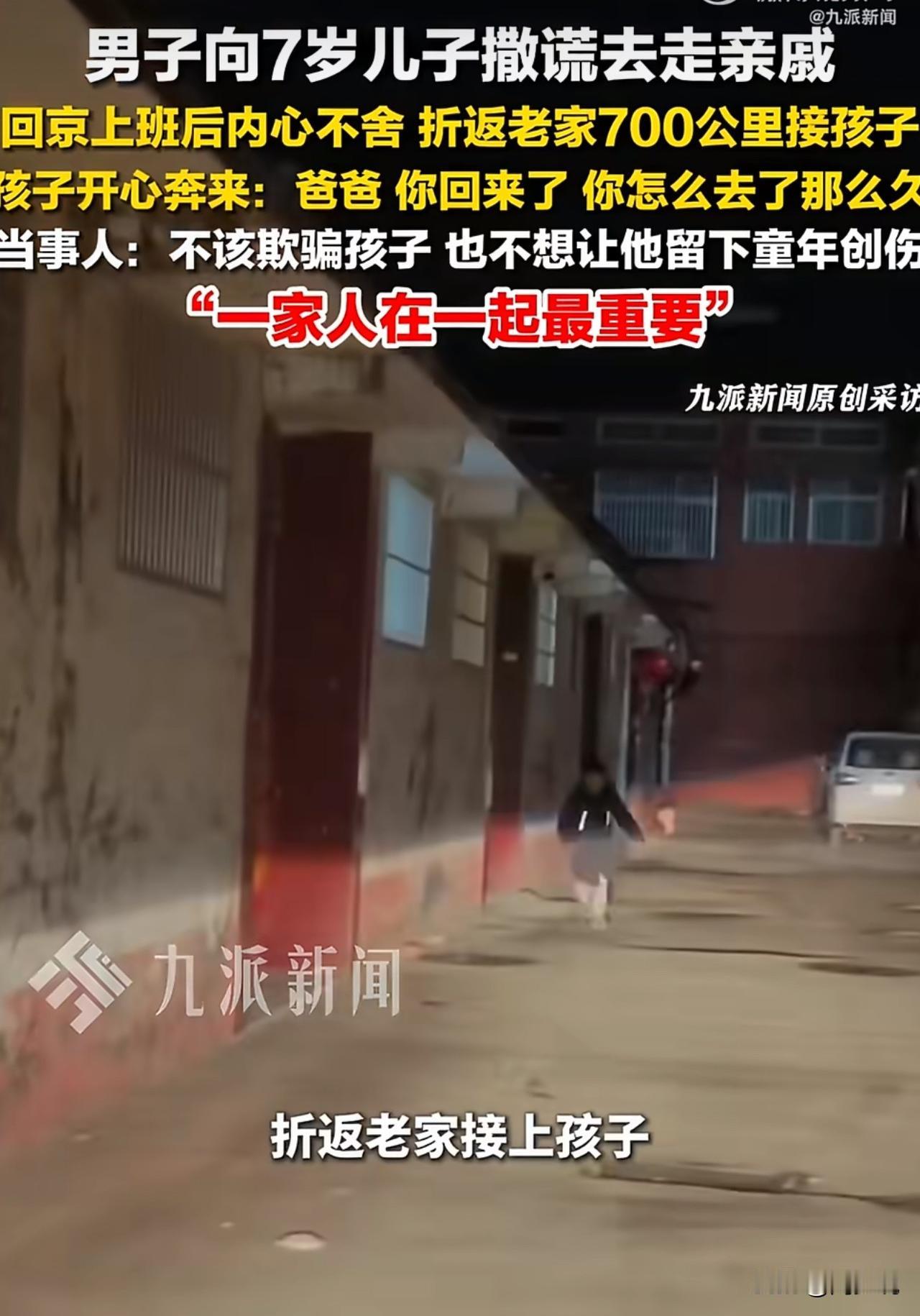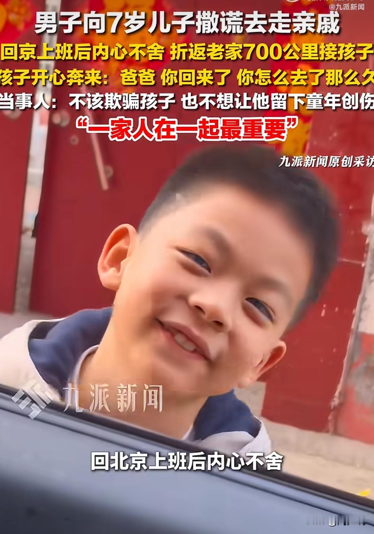 #男子谎称走亲戚欲把7岁儿子留老家#“全网破防!”山东单县,一男子因工作调动,本想把7岁儿子留老家一年,怕孩子哭闹,便撒了个善意的谎,说去走亲戚,儿子听后也是笑着挥手说拜拜。 驱车返京后,男子心里始终空落落的,刷到网友分享的留守童年创伤,更是彻夜难安。他当即决定,第二天驱车700公里折返接娃。推门那一刻,孩子飞奔而来,奶声奶气说“我睡的是你的被窝”,瞬间戳中所有人泪点。 此视频曝光后,瞬间引发热议。网友纷纷留言:“爸爸的折返,比任何道理都珍贵”。 也有网友表示:“童年没法重来,陪伴才是最好的养育”。 还有人感慨:“很多父母为生计被迫分离,能勇敢回头,真的很不容易”。 这事看下来,周少想说我们总说为孩子打拼,却常常忽略,孩子最需要的不是优渥生活,而是朝夕相伴的安全感。 7岁正是情感依赖的关键期,一句谎言、一次分离,都可能会在心底留下浅浅的印记。男子说,不想让孩子留童年创伤,一家人在一起最重要,这话朴素却戳心。 生活的难处或许暂时无解,但童年的缺口很难弥补。不用追求完美父母,愿意倾听孩子的心声,及时修正选择,这就是最棒的养育。 比起物质给予,稳稳的陪伴、真诚的沟通,才能帮孩子攒够面对世界的勇气。这趟700公里的奔赴,不止接回了孩子,更守住了一份珍贵的亲子温情。#周少说教育# #寻美三湘#