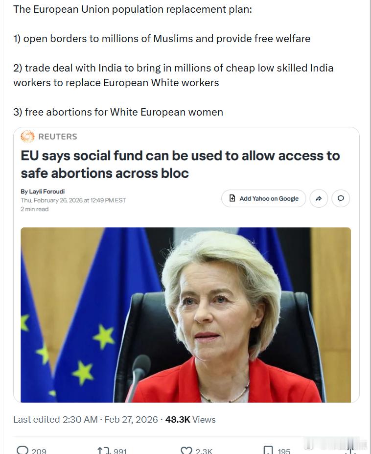 欧盟的人口更替计划:1)对数百万穆斯林开放边境并提供免费福利2)与印度达成贸易协