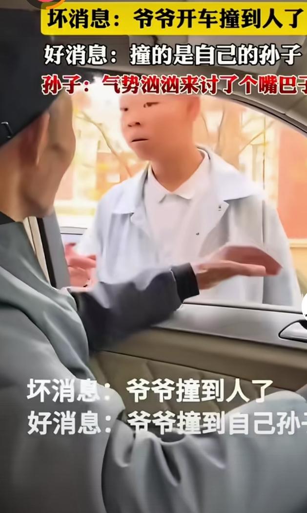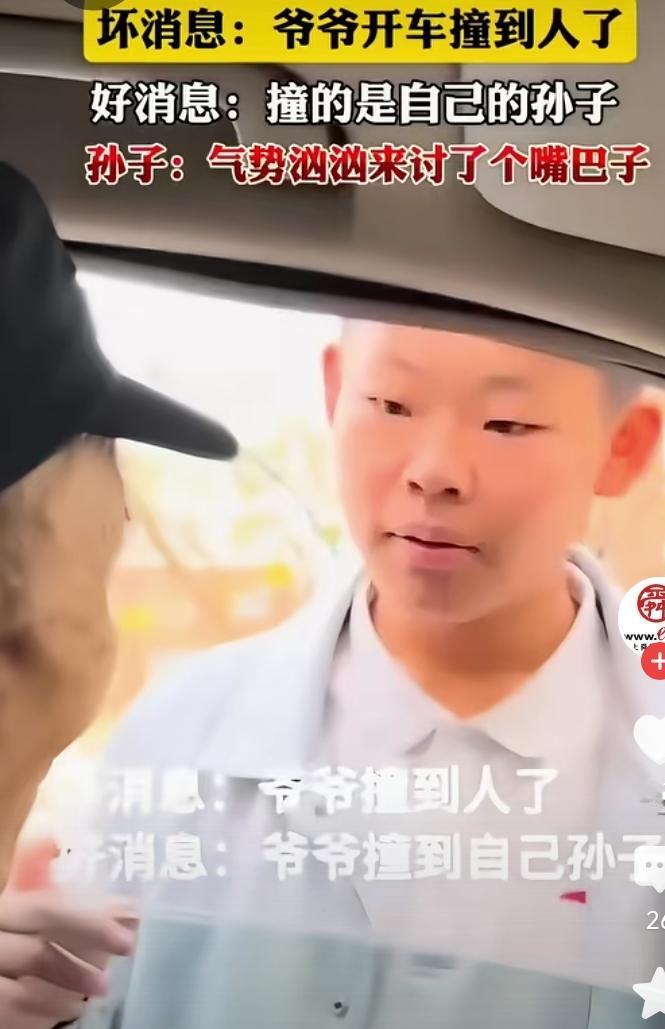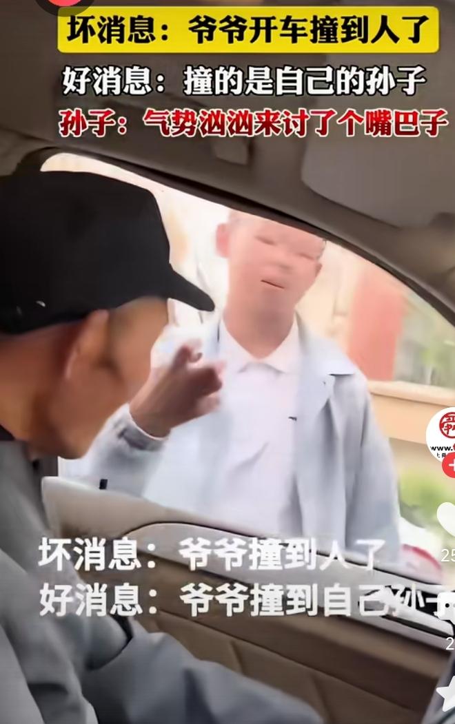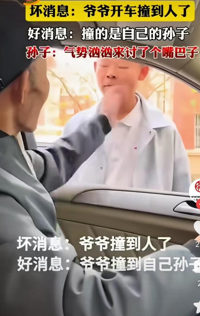 小子骑电动车被车碰倒了,他爬起来气势汹汹的找车主问罪。 没想到打开车窗一看,车主竟然是爷爷。 他呆立当场,还挨了爷爷的一个小耳刮。 爷爷训他道,看你能的,骑车不守规则,还要找爷爷问罪!分不清大小王了是吧。 骂完,爷爷驾车一骑绝尘,留下孙子在风中凌乱。