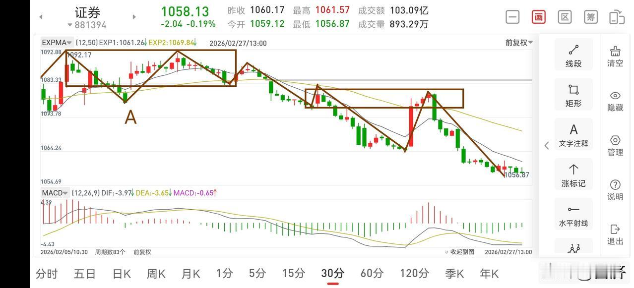 聊聊证券板块(2026.2.27) 今天证券板块维持了一个小幅震荡走势,目前在操作上会有一些小机会,但总体日线一笔还没调整结束,还需耐心等待。 1.从30分钟图一上看,此处在技术上有构建三卖的技术需求,待构建完成后,还会有一个下探的过程,所以在该级别上是没有走结束的,还会有下探的空间。 2.从5分钟图二上看,目前正在沿着5分钟中枢做上下震荡,这跟昨天的文章内容预期是一致的,目前已经走了6笔5分钟,等到第8笔回踩结束,即可考虑回补三成仓位,防止它第9笔的反弹进入上方30分钟中枢区间,虽然进入中枢的概率不大,但第9笔至少会有一个不错的反弹,是可以考虑博弈一下的,如果它未能进入30分钟中枢区间,那就是30分钟的三卖,总之无论它是否进入中枢区间,第9笔反弹走完,都是要考虑把三成仓位退出来的。因为此处级别太小,结构转换比较快,不会操作的可以继续考虑7成仓位持股不动,耐心等待日线一笔调整结束后再介入也不迟。 3.商业航天已进入调整尾声,振幅并不会很大,耐心持股等待第二波上涨即可。天南地北大拜年 证券板块解析