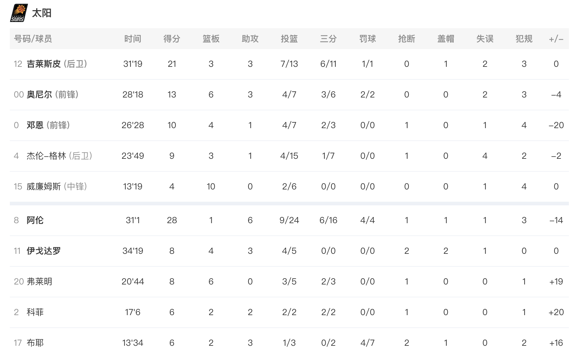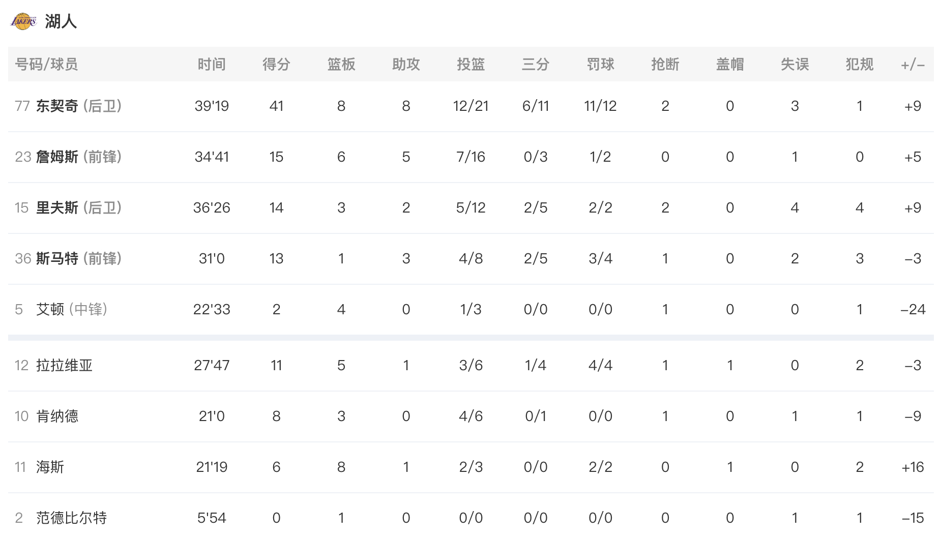 詹姆斯15分6篮板5助攻,东契奇41分8篮板8助攻2抢断,里夫斯14分3篮板2助攻2抢断,斯玛特13分3助攻,艾顿2分4篮板,拉拉维亚11分5篮板,海斯6分8篮板,肯纳德8分3篮板。