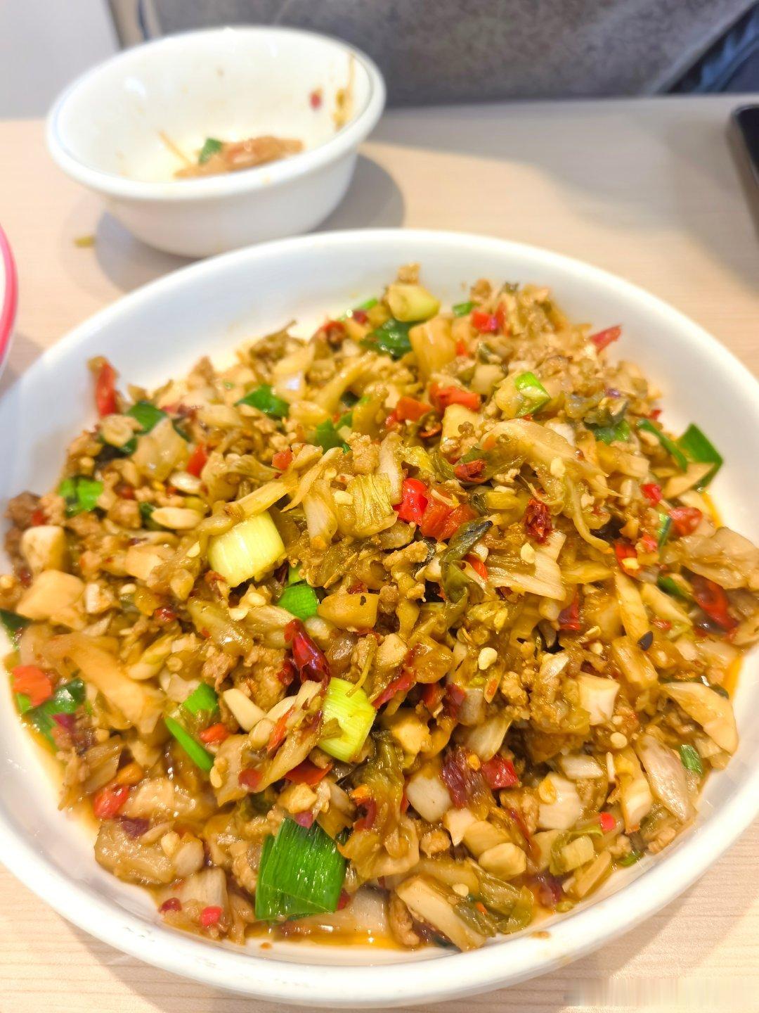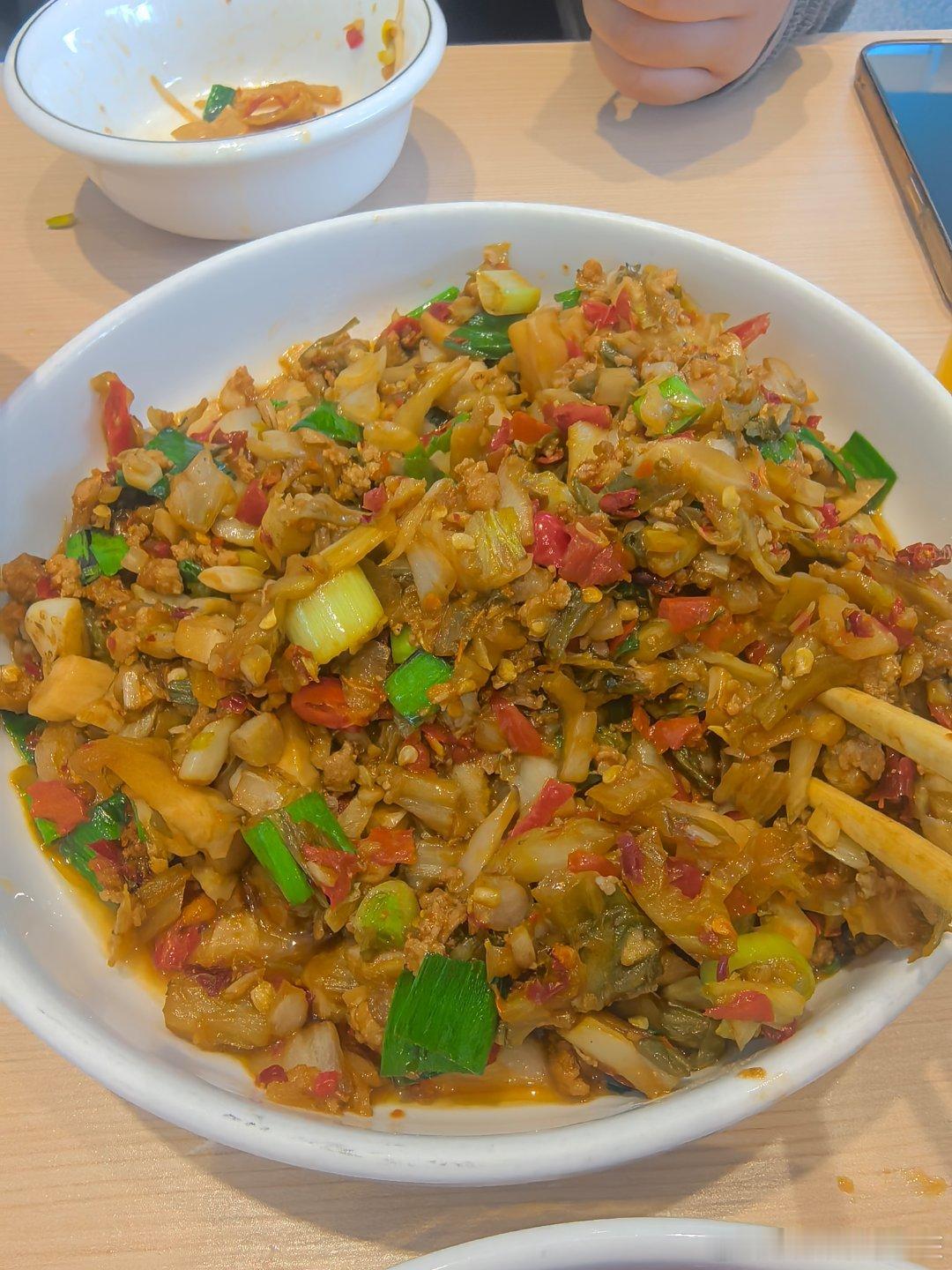第四道酸菜炒肉,对我来说毫无兴致,北方人不认这种酸菜写到这里还没尝一口,嗯!,吃了一口,咸,酸,辣。这算菜吗?像是酒店自助餐的面条卤子吧,难怪那么便宜,22块,打包回来当酱吃吧