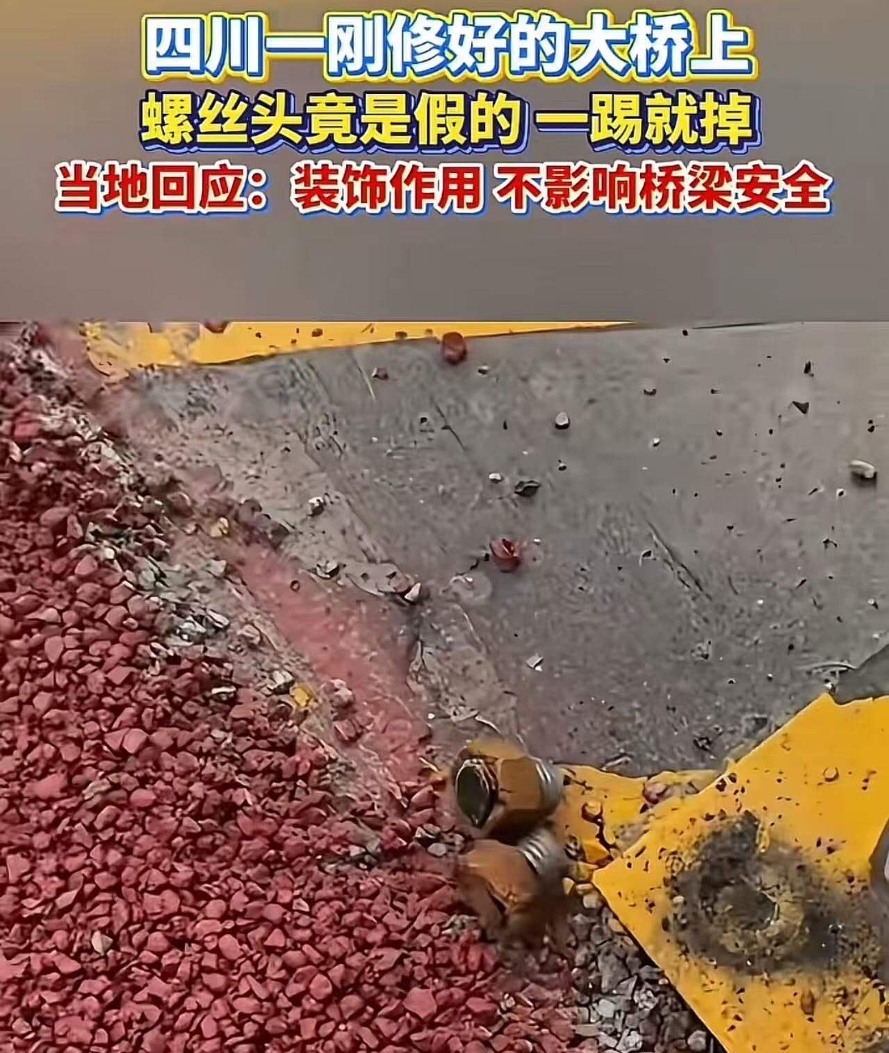 四川一刚修好的大桥上,螺丝头竟是假的,一踢就掉!当地回应:装饰作用,不影响桥梁安全!网友:实在想不通弄个假螺丝去装饰的审美!是为了弄虚作假吧! 这件事真是让人哭笑不得。大桥作为关系公共安全的重要基础设施,螺丝这种看似不起眼的细节,本应严丝合缝,确保结构稳固。结果竟然出现“假螺丝头”,而且还能轻易踢掉,难免让人质疑施工的严谨与诚信。 官方回应称是假螺丝仅仅是装饰作用,不影响桥梁安全,听起来似乎合情合理。但网友的质疑也不无道理:既然是装饰,为什么不干脆用更隐蔽的方式?假螺丝的存在,是否有“表面功夫”甚至“弄虚作假”的嫌疑?难免让人怀疑背后是否存在为了美观掩盖施工瑕疵的现象。 这反映出当前部分工程管理和监督中仍存在的漏洞。基础设施安全关乎千家万户的生命财产安全,任何敷衍了事的细节都可能埋下隐患。更重要的是,公众对工程质量的信任一旦被破坏,相关部门的公信力也会大打折扣。 网友的评论不仅仅是吐槽,更是一种对质量和诚信的呼声。希望相关部门能够正视问题,公开透明地进行调查和整改,确保每一处细节都经得起考验,不给“假冒伪劣”留任何空间。 同时,这也提醒我们,工程质量的保障不仅靠技术,更靠责任心和良知。任何“假装完美”的做法,终将被时间和公众的眼睛揭穿。只有扎实的质量和真诚的态度,才能筑牢安全的防线,赢得人民的信赖。 你怎么看这起“假螺丝”事件?你觉得在公共工程中,如何才能杜绝类似的“表面功夫”?欢迎留言分享你的看法。毕竟,安全无小事,诚信更无小节。桥梁螺丝 方头螺丝螺栓 飞桥轮胎螺丝 塑料头螺栓 异型头螺栓 牌照螺钉卡扣 螺丝头安全扣
