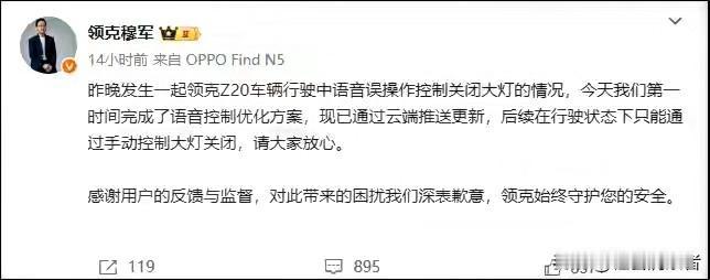 吓出冷汗!领克语音识别出错,高速关灯撞护栏,智能车机别拿安全当儿戏! 凌晨高速、无路灯、全车灯光突然熄灭,领克Z20车主遭遇的惊魂一幕,给所有智能汽车厂商敲响了警钟! 2月26日,有车主爆料,自己驾驶领克Z20在高速行驶时,仅想用语音关闭车内阅读灯,车机却误判指令,直接关掉包括大灯在内的所有灯光。车主慌乱中多次语音呼叫开灯,车机却反复回复“暂时还不会哟”,最终车辆因视线全黑撞上护栏,万幸没有人员伤亡。 事发后,领克官方迅速回应,承认是语音误操作导致事故,并已通过云端推送OTA更新,明确行驶中大灯仅支持手动关闭,从逻辑上杜绝同类风险。官方致歉的态度值得肯定,但事件暴露的安全隐患不容忽视。 智能语音本是为了提升驾驶便捷与安全,却因识别不准、逻辑漏洞,变成高速路上的“隐形杀手”。汽车智能化,核心永远是安全优先,涉及灯光、刹车、转向等关键功能,必须设置物理冗余与强制保护,绝不能完全交给语音算法。 这次领克快速修复是好事,但更希望所有车企引以为戒:便捷可以迭代,安全不能试错。别让科技便利,变成危及生命的隐患!领克语音识别故障