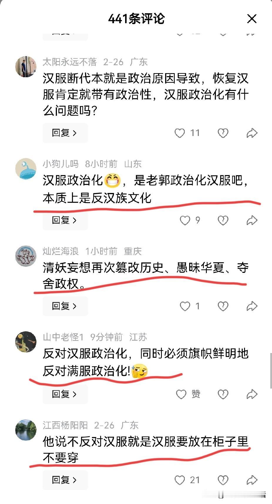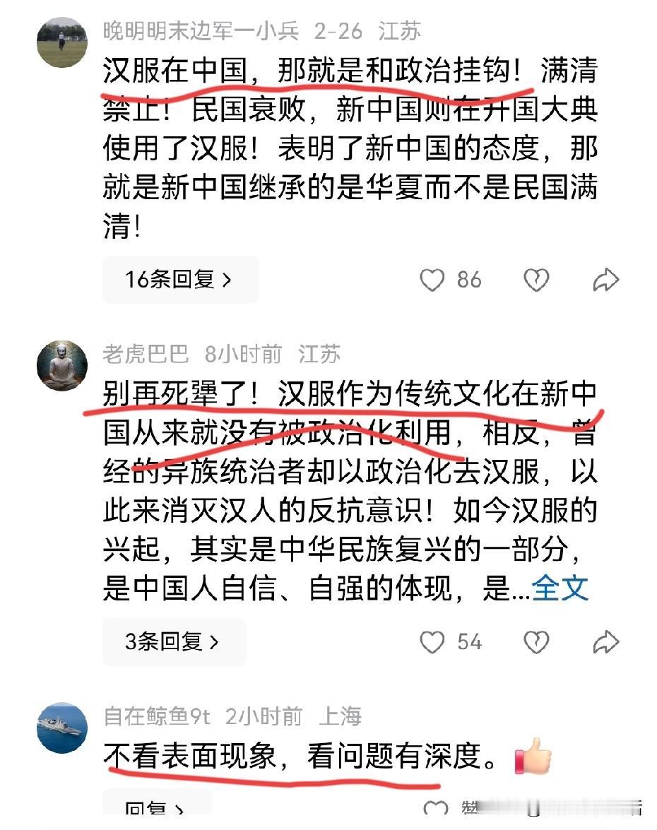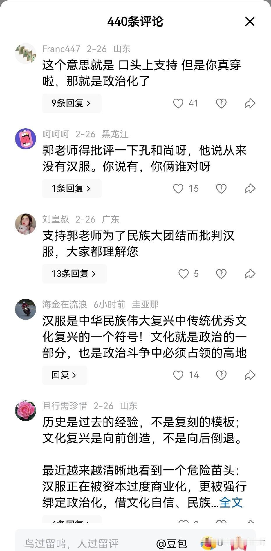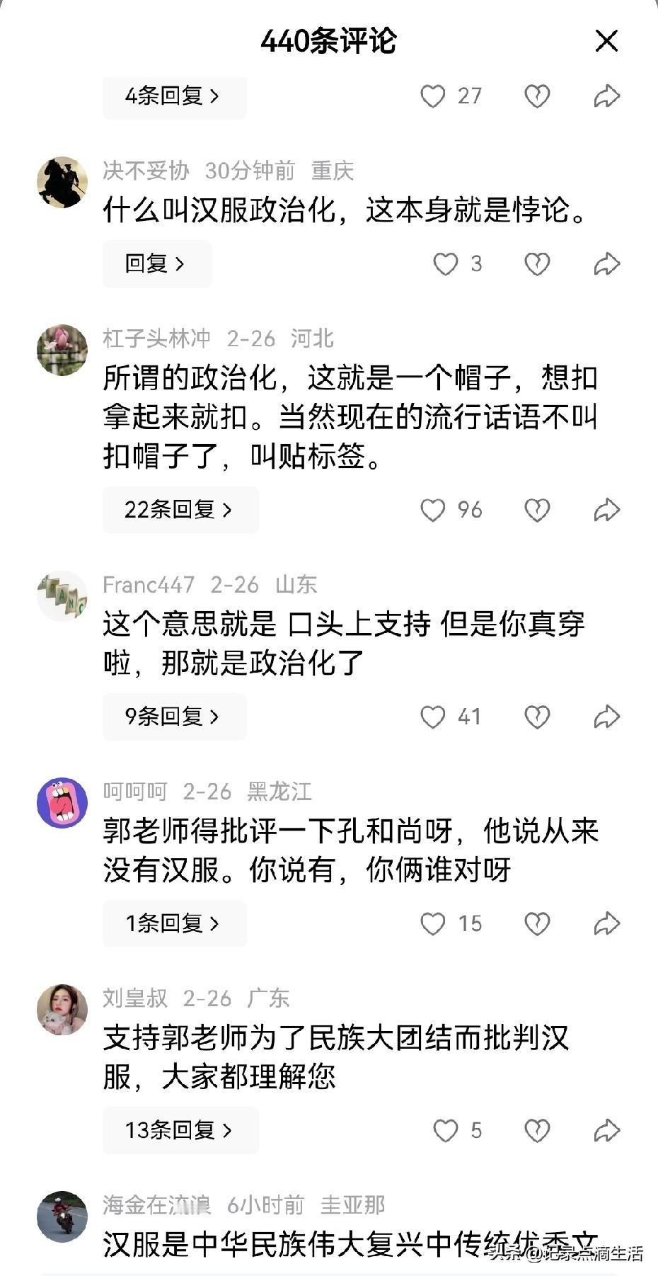 郭松民说他不反对汉服,只是反对汉服政治化。 除了老胡以外,没想到还有这么多人支持他,不过好像反对的更多一点吧。 文化人就是不一样,同样的话,重新组织一下就有完全不一样的意思。真有点就像网友说的,他是口头说支持你,如果你真穿出来了,那就是被政治化了的感觉。 现在不得不让我们进行反思,到底谁在把汉服政治化呢?难道不正是那些害怕中国人穿汉服的人,故意引向政治对立从而打压中华文化的一群人吗?这些年来从中医中药到中华古代经典乃至中国考古,无不在这群人的抹黑之中。 曾几何时中山装,大家无异义,曾几何时引进的西装都可以成为正装,大家也无任何异义,甚至穿奇装异服的非主流都可以接纳。为何到了汉族人自己穿的汉服却多次被攻击,并冠之于政治化?那些公知和土殖们不政治化,群起而攻之,老百姓最多也就看个乐,增添一点过节气氛罢了。 世间本无事,庸人自扰之。