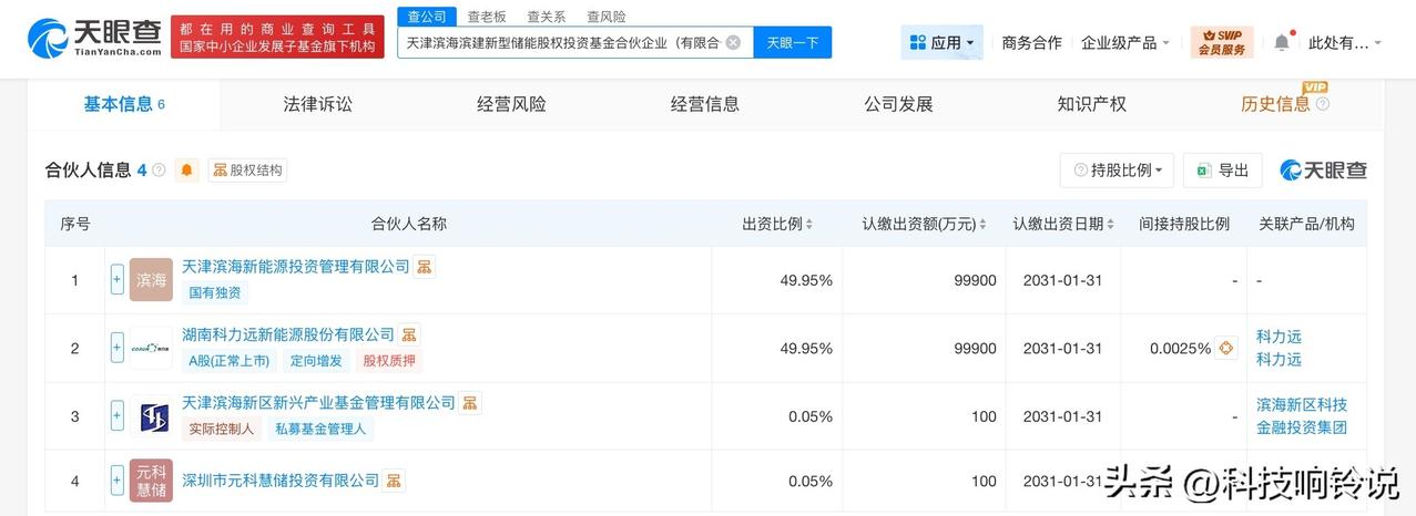 【天津滨海滨建新型储能股权基金成立 出资额20亿】 天眼查App显示,近日,天津滨海滨建新型储能股权投资基金合伙企业(有限合伙)成立,执行事务合伙人为天津滨海新区新兴产业基金管理有限公司,出资额20亿人民币,经营范围为以私募基金从事股权投资、投资管理、资产管理等活动。合伙人信息显示,该基金由天津滨海新能源投资管理有限公司、科力远(600478)、天津滨海新区新兴产业基金管理有限公司、深圳市元科慧储投资有限公司共同出资。 天眼查信息: