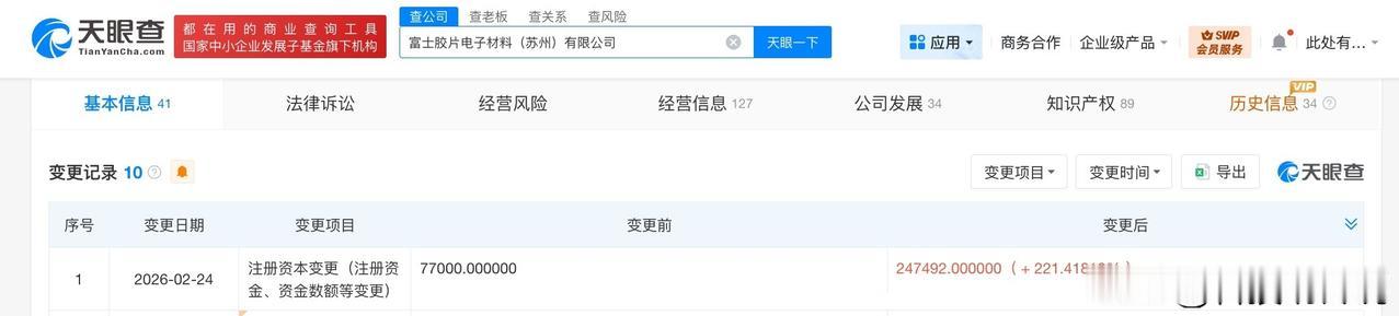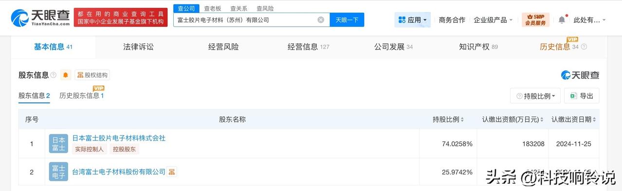 【富士胶片电子材料公司增资至24.7亿日元 增幅约221%】 天眼查App显示,近日,富士胶片电子材料(苏州)有限公司发生工商变更,注册资本由7.7亿日元增至约24.7亿日元,增幅约221%。 该公司成立于2005年1月,法定代表人为KOBAYASHI SHIGEKI,经营范围含研究开发并生产半导体、液晶、新型平板显示器件、元器件的专用器材及其关连产品,以及研究开发并生产新型电子元器件、新型仪表元器件和材料及其关连产品等,由日本富士胶片电子材料株式会社、台湾富士电子材料股份有限公司共同持股。 天眼查信息: