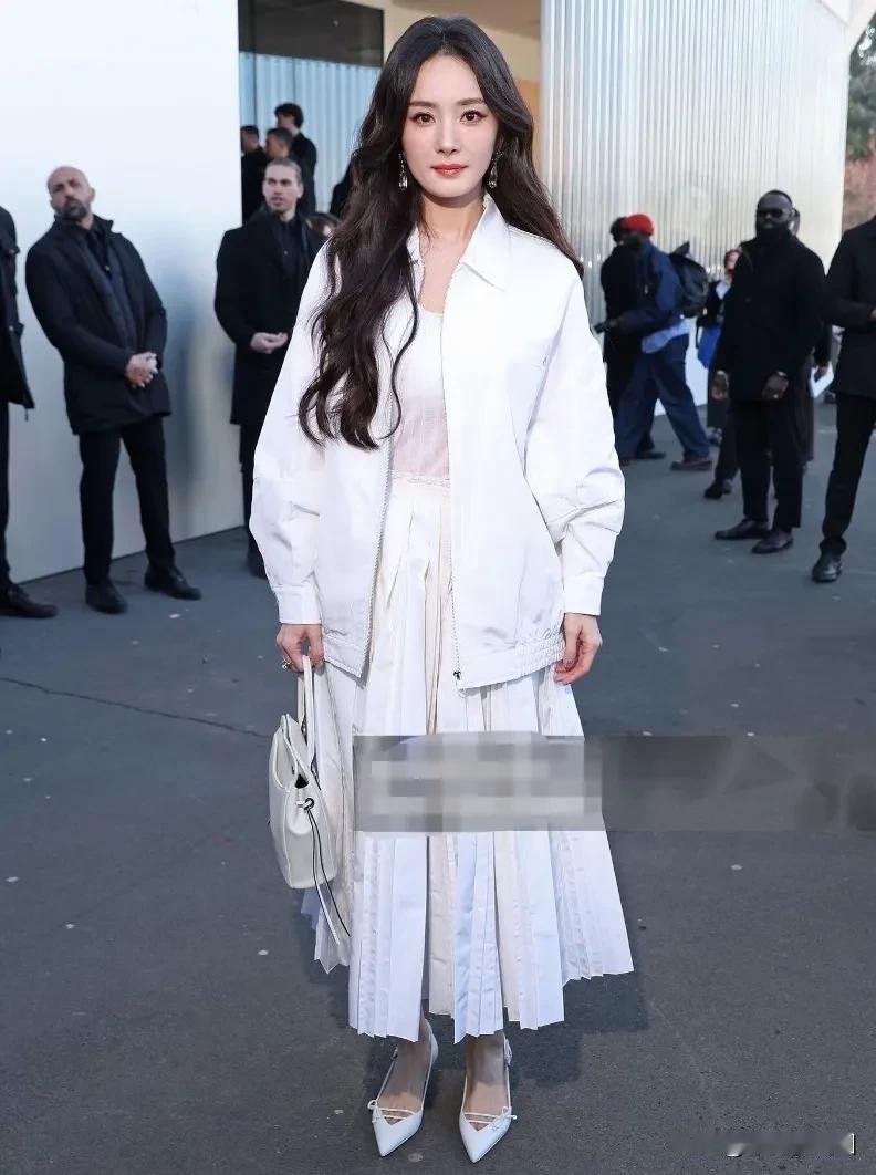 prada米兰时装周大秀明星生图,美女们的状态都好好,尤其是杨幂一袭白色套装,上身休闲夹克装,下身裙子,真的很知性美丽可人。