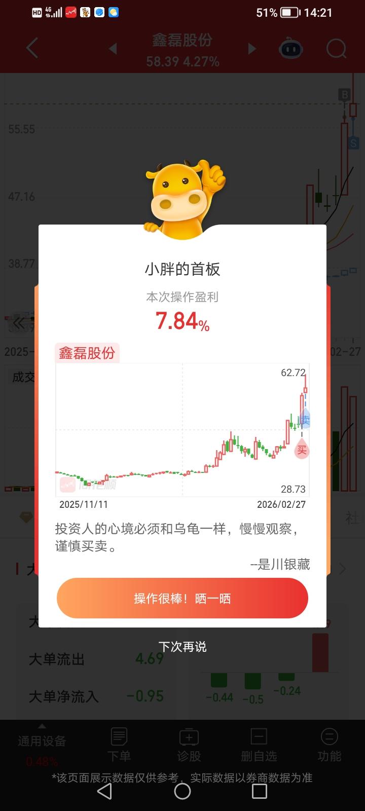 2月27日实盘:鑫磊大肉获利出局,大回血后依然难掩遗憾! 1、鑫磊股份 买入思路:鑫磊是昨天尾盘介入的一只炸板股,它是算力方向的分支数据中心方向个股,昨天盘中是有强势封板创出历史新高的,再加上整个算力昨天是有高潮表现的,它炸板后其实资金整体承接力度非常好,尾盘想要封板其实非常简单,毕竟只需要不到1千万就能封死,但是就是这样的情况下,尾盘就是不封,而且尾盘集合竞价只成交了不到5百万,这说明卖盘已经非常少了,再加上算力方向隔日开盘是有惯性冲高的,所以鑫磊不去封板是有资金刻意为之,就是典型的做成炸板预期差,并且它昨天板上成交额占总成交额的20%以上,这说明是有很多主力资金在板上承接的,而且近期20cm方向的活跃板块个股就算炸板也很容易走出持续性,最近的润泽、明阳都是炸板够非常强势,所以尾盘竞价介入鑫磊博弈隔日得修复冲高会是非常不错的选择! 卖出思路:鑫磊竞价开盘阶段几百万的卖盘就能诱空杀跌10多个点,到20分之后的成交额依然非常小,直到竞价最后阶段才出现资金明显抢筹,最终高开后已经非常接近昨天的涨停价,这在竞价阶段明显偏弱的数据中心方向是非常少见的,开盘后整个板块趋势拉升,鑫磊也是出现资金强势承接做多,在第一波拉升出现明显滞涨且板块整体情绪不强的情况下,选择快速在59的位置卖出部分仓位,之后再次大幅拉升回落时继续在61.30位置卖出部分仓位,之后开始出现大幅下杀回落,选择在60.48位置继续卖出,最后的仓位是在拉升无法突破前期高点情况下在61.50位置清仓,可惜清仓后再次出现了一次突破拉升,整体除了第一卖点有点急之外,卖点还是不错的,这只个股当日最终盈利7.84%,算是回了一口非常大的血! 鑫磊分时均线有强支撑的情况下为什么不选择格局? 最近20cm方向想要连续大涨其实非常少,而且短线市场板块轮动加速,所以很多资金就是做套利,那么在已经拉升到10多个点的情况下不继续去冲板其实就是弱势的表现,再加上鑫磊的辨识度并不高,所以短线在大幅获利的情况下及时出局或许会好一些! 这周小胖其实非常惨,大位割在最低点,之后连续反弹,首都虽然格局一天后亏损控制在5个多点,但是依然是倒在黎明前,这也是超短最难受的地方,内心不够强大确实挺伤人的,只能说现在超短确实特别难做,题材轮动非常快,这就逼得你去更好的完善自身的模式,小胖同样是挨打后反复更正,只不过这次伤得非常深而已! 以后的实盘可能会选择只更新清仓的个股,新介入的个股直到卖出才会再次更新,毕竟还是很怕被精准打击的,所以请粉丝朋友们见谅! 本文只限于分享和交流,不构成投资建议,股市有风险,投资需谨慎!